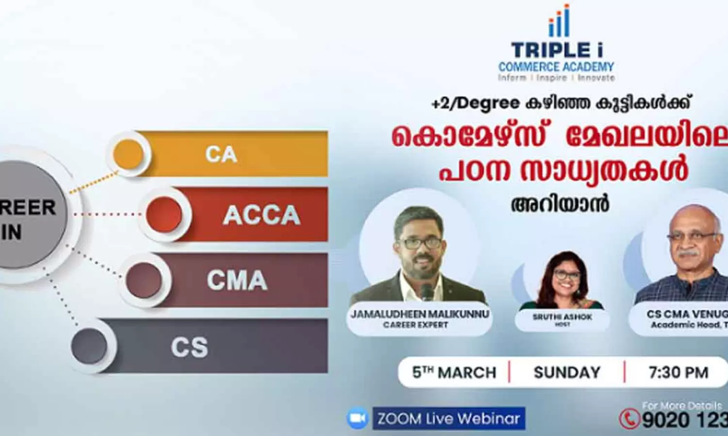 ഫിനാന്ഷ്യല് രംഗത്ത് മികച്ച കരിയര് ആഗ്രഹിക്കുന്ന വിദ്യാര്ത്ഥികളുടെ സംശയങ്ങള്ക്ക് മറുപടിയുമായെത്തുകയാണ് മീഡിയവണ്. ട്രിപ്പിള് ഐ കൊമേഴ്സ് അക്കാദമിയുമായി സഹകരിച്ച് മീഡിയവണ് നടത്തുന്ന സൗജന്യ വെബ്ബിനാര് ഇന്ന് വൈകീട്ട് 7.30നാണ്. CA, ACCA, CMA, CS അടക്കം കൊമേഴ്സ് മേഖലയിലെ പഠനസാധ്യതകളെ കുറിച്ചുള്ള വിദ്യാര്ത്ഥികളുടെയും രക്ഷിതാക്കളുടെയും എന്ത് സംശയങ്ങള്ക്കും വെബ്ബിനാര് സഹായകമാകും.