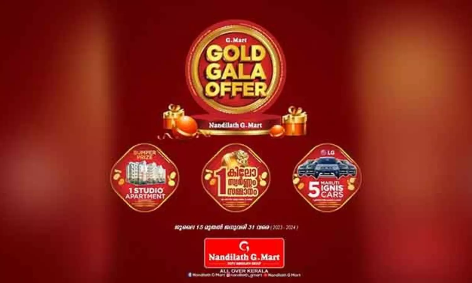 ഡിജിറ്റൽ ഗാഡ്ജറ്റ്സുകൾക്കും ഗൃഹോപകരണങ്ങൾക്കും നിരവധി ഓഫറുകളും വമ്പിച്ച ഡിസ്കൗണ്ടുകളുമാണ് നന്തിലത്ത് ജി-മാർട്ട് ഈ ഓണക്കാലത്ത് ഒരുക്കുന്നത്. ഈ വർഷത്തെ പൊന്നോണത്തിന് ഗോൾഡ് ഗാല ഓഫറുമായാണ് നന്തിലത്ത് ജി മാർട്ട് എത്തുന്നത്. ഗോൾഡ് ഗാല ഓഫറിലൂടെ തെരഞ്ഞെടുക്കപ്പെടുന്ന എല്ലാ ഭാഗ്യശാലികൾക്കും സമ്മാനങ്ങൾ. സ്റ്റുഡിയോ അപ്പാർട്ട്മെന്റ്,മാരുതി ഇഗ്നിസ് കാറുകൾ, ഒരു കിലോ സ്വർണം തുടങ്ങിവയാണ് സമ്മാനങ്ങൾ.