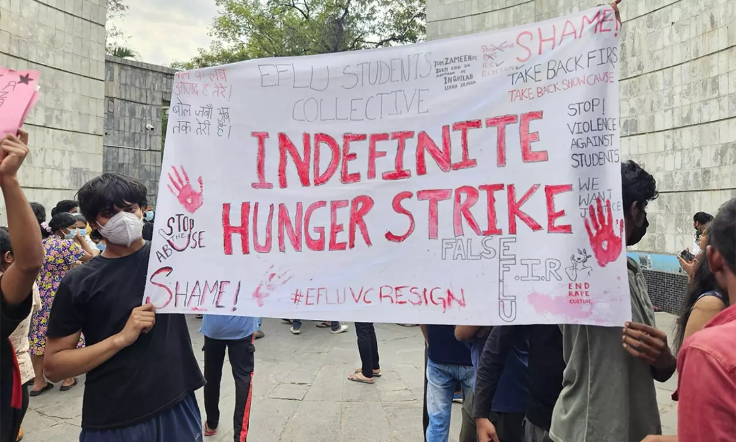ഹൈദരാബാദ് ഇഫ്ളു കാമ്പസില് ഒക്ടോബര് 18ന് രാത്രി വിദ്യാര്ഥിനിക്ക് നേരെയുണ്ടായ ലൈംഗികാതിക്രമത്തില് അതിജീവിതക്ക് നീതി ഉറപ്പാക്കണമെന്ന് ആവശ്യപ്പെട്ടുള്ള സമരം ഇരുപത് ദിവസം പിന്നിട്ടു. ഇപ്പോള് വിദ്യാര്ഥികള് അനിശ്ചിതകാല നിരാഹാര സമരത്തിലേക്ക് കടന്നിരിക്കുകയാണ്. നവംബര് ആറിന് നിരാഹാര സമരം ആരംഭിച്ച ഉടനെ തന്നെ യൂണിവേഴ്സിറ്റി വൈസ് ചാന്സലറുടെ നേരിട്ടുള്ള നിര്ദേശ പ്രകാരം പൊലീസ് കാമ്പസില് പ്രവേശിക്കുകയും വിദ്യാര്ഥികളെ ബലം പ്രയോഗിച്ച് സമരത്തില് നിന്ന് പിന്തിരിപ്പിക്കാനുള്ള ശ്രമം ആരംഭിക്കുകയും ചെയ്തു. തുടര്ന്ന് അരമണിക്കൂറിലേറെ തെലങ്കാന പൊലീസിന്റെ അതിക്രമങ്ങള്ക്ക് കാമ്പസ് സാക്ഷ്യം വഹിച്ചു.
