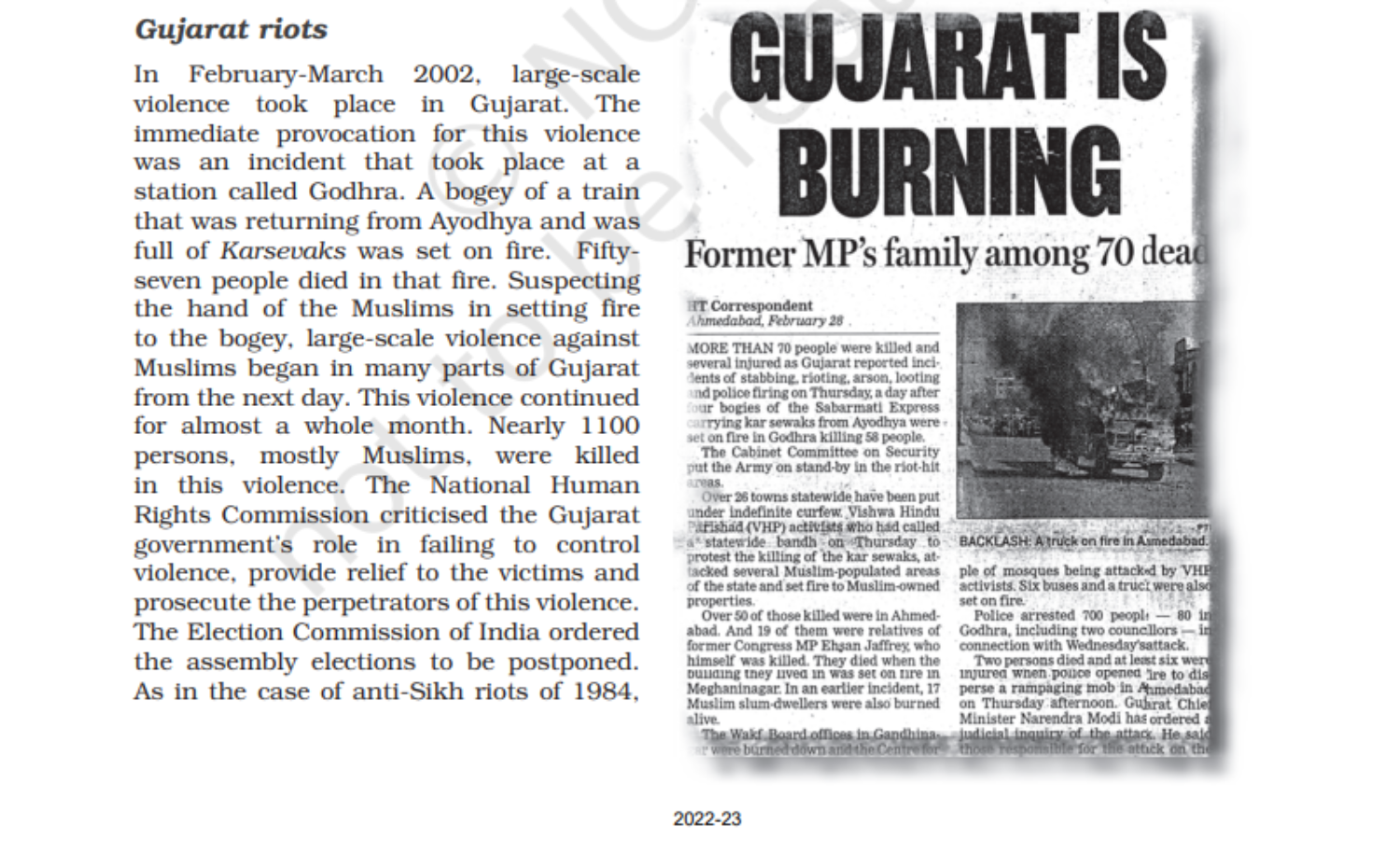 ഒഴിവാക്കിയ പാഠഭാഗത്തില് ഇപ്രകാരം പറയുന്നു: ''ഗുജറാത്തിലെന്നപോലെ, രാഷ്ട്രീയ ആവശ്യങ്ങള്ക്കായി മതപരമായ വികാരങ്ങള് ഉപയോഗിക്കുന്നതില് ഉള്പ്പെട്ടിരിക്കുന്ന അപകടങ്ങളെക്കുറിച്ച് നമ്മളെ ബോധവാന്മാരാക്കുന്നു. ഇത് ജനാധിപത്യ രാഷ്ട്രീയത്തിന് ഭീഷണിയാണ്. '