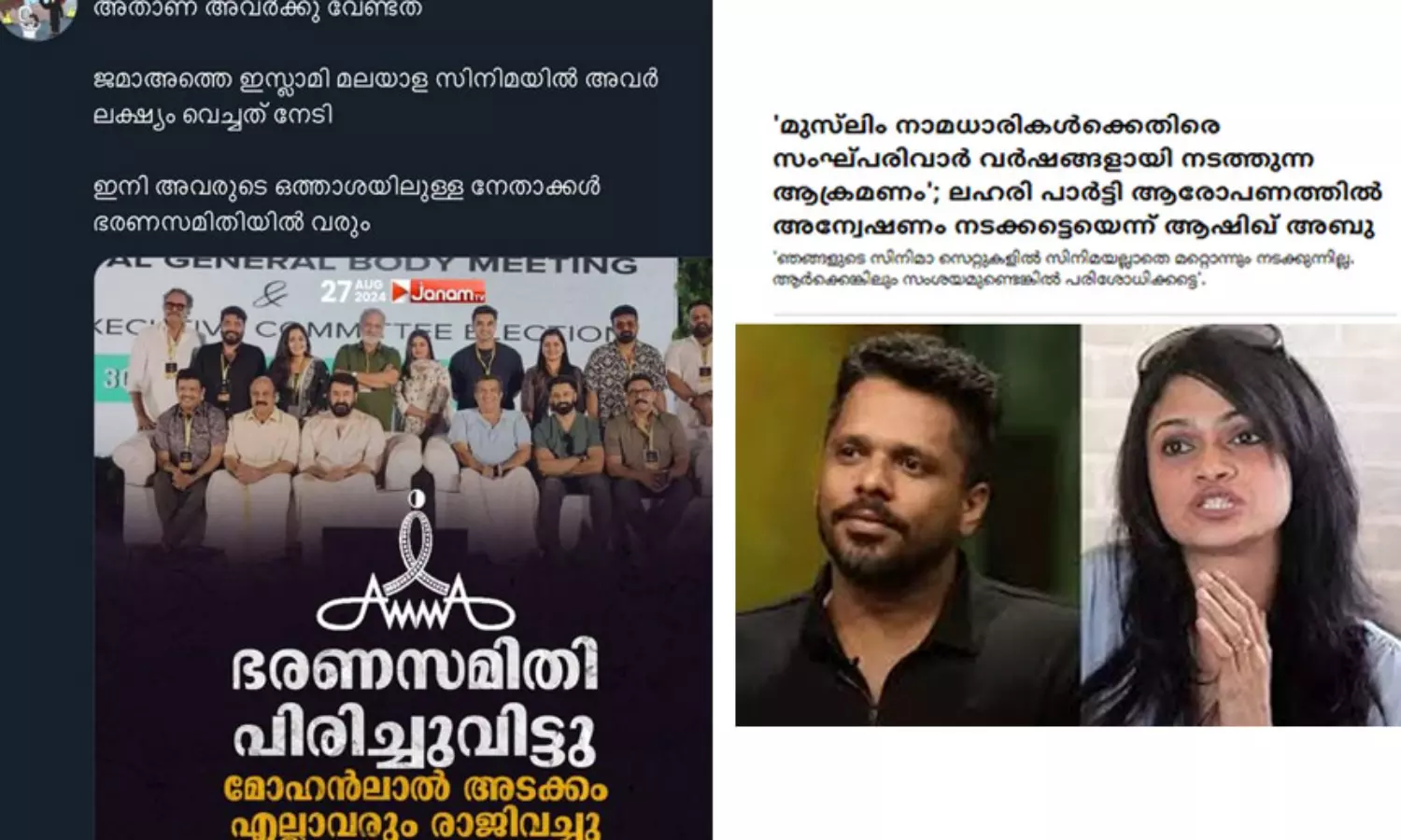 ഹേമ കമ്മിറ്റി റിപ്പോര്ട്ട് മലയാള സിനിമയിലെ നടീനടന്മാരും സാങ്കേതികപ്രവര്ത്തരും നിര്മാണ-സംവിധാനരംഗത്തു പ്രവര്ത്തിക്കുന്നവരും തമ്മിലുള്ള പ്രശ്നമാണ്. എന്നിട്ടും വിവാദം പൊട്ടിപ്പുറപ്പെട്ട് ഏറെ താമസിയാതെ ഒരു മുസ്ലിംബന്ധം ചര്ച്ചയിലേക്ക് കടന്നുവന്നു. സിനിമയ്ക്ക് പുറത്തുള്ള മുസ്ലിംകള്ക്കും മുസ്ലിംസംഘടനകള്ക്കും ഈ വിവാദമുണ്ടാക്കിയതില് പങ്കുണ്ടെന്നും സിനിമാരംഗത്തുനിന്ന് ഹിന്ദു-സവര്ണ വിഭാഗങ്ങളെ പുറത്താക്കാനുള്ള ശ്രമമാണ് നടക്കുന്നതെന്നുമായിരുന്നു ഒരു ചര്ച്ച. കള്ളപ്പണത്തിലൂടെയും ലഹരിയിലൂടെയും ലൈംഗിക അരാജകത്വത്തിലൂടെയും മലയാള സിനിമയെ മലിനീകരിക്കുന്നത് മുസ്ലിംകളാണെന്നതായിരുന്നു മറ്റൊരു പ്രമേയം. ആഷിഖ് അബുവിനെപ്പോലുള്ള ഇടത് സിനിമാപ്രവര്ത്തകരെ ലക്ഷ്യമിട്ടാണ് ഈ ആരോപണം ഉയര്ന്നുവന്നത്. തന്റെ മുസ്ലിംസ്വത്വത്തിനു നേരെയുള്ള ആക്രമണമാണിതെന്ന് അദ്ദേഹം തിരിച്ചറിയുക മാത്രമല്ല, അതിനെ ചോദ്യംചെയ്യുകയും ചെയ്തു. പൗരത്വഭേദഗതി നിയമത്തില് പരസ്യ നിലപാടെടുത്തതിന്റെ പ്രതികാരമാണ് തനിക്കെതിരേയുള്ള ആക്രമണമെന്ന് അദ്ദേഹം പറഞ്ഞതായി മാധ്യമങ്ങളും റിപ്പോര്ട്ട് ചെയ്തു.