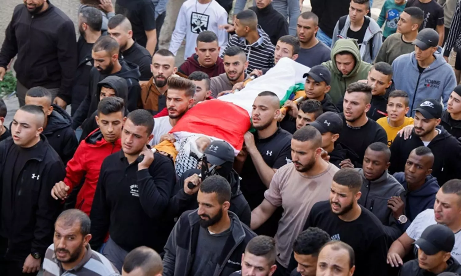 മഹ്മൂദിന്റെ ഭൗതികശരീരം - ഫലസ്തീൻ പതാകയിൽ പൊതിഞ്ഞ് - ഓറഞ്ച് സ്ട്രെച്ചറില് ജെനിനിലെ തെരുവുകളിലൂടെ ഉയര് ത്തിക്കൊണ്ടുപോയി.