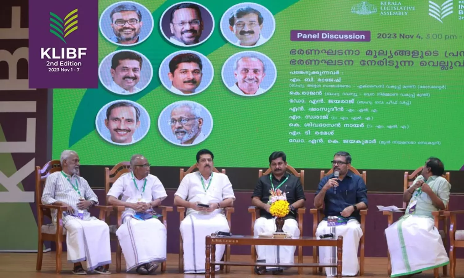 കേരള നിയമസഭാ അന്താരാഷ്ട്ര പുസ്തകോത്സവത്തോടനുബന്ധിച്ച് നടന്ന പാനല് ചര്ച്ചയില് ഇന്ത്യയുടെ ഭരണഘടന നേരിടുന്ന വെല്ലുവിളികളെക്കുറിച്ചും ഭരണഘടനാ മൂല്യങ്ങളെക്കുറിച്ചും സംവാദം നടന്നു. റവന്യു വകുപ്പ് മന്ത്രി കെ.രാജന്, ഗവ. ചീഫ് വിപ്പ് ഡോ. എന്. ജയരാജ്, എന്. ഷംസുദീന് എം.എല്.എ, മുന് എം.എല്.എമാരായ എം. സ്വരാജ്, കെ. ശിവദാസന് നായര്, മുന് നിയമസഭാ സെക്രട്ടറി ഡോ. എന്.കെ ജയകുമാര് എന്നിവര് പങ്കെടുത്ത 'ഭരണഘടനാ മൂല്യങ്ങളുടെ പ്രസക്തിയും ഭരണഘടന നേരിടുന്ന വെല്ലുവിളികളും' എന്ന വിഷയത്തില് നടന്ന ചര്ച്ചയില് തദ്ദേശ സ്വയംഭരണ വകുപ്പ് മന്ത്രി എം.ബി രാജേഷ് മോഡറേറ്ററായി.