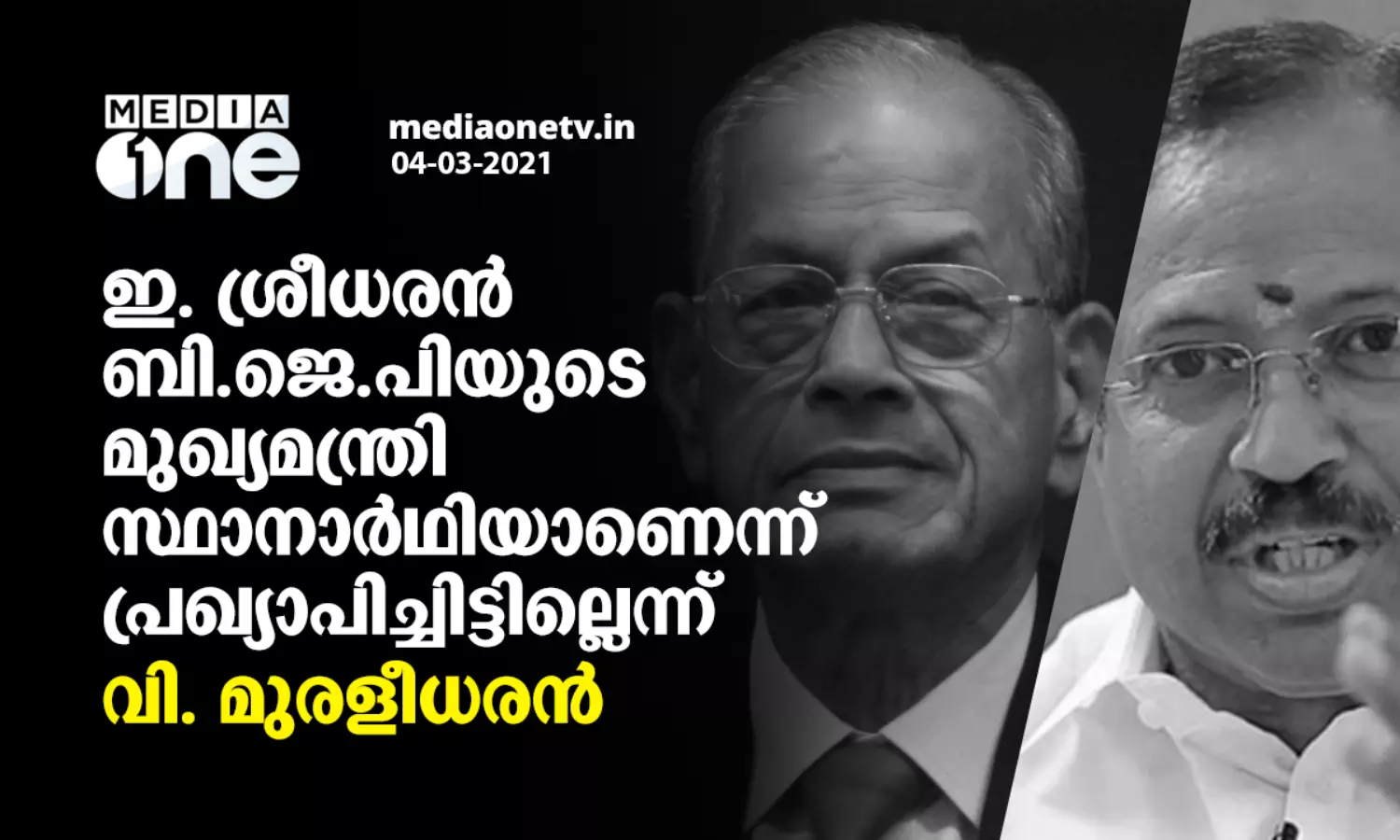 ശ്രീധരനെ മുഖ്യമന്ത്രി സ്ഥാനാർഥിയായി പാർട്ടി പ്രഖ്യാപിച്ചതായി മാധ്യമ റിപ്പോർട്ടുകൾ കണ്ടു. പാർട്ടി അധ്യക്ഷനുമായി താൻ സംസാരിച്ചിരുന്നു. അദ്ദേഹം അത്തരത്തിലൊരു പ്രസ്താവനയും നടത്തിയിട്ടില്ലെന്ന് പറഞ്ഞു. കേരളത്തിലെ ചില പ്രശ്നങ്ങൾ താൻ ചൂണ്ടിക്കാട്ടുകയാണ് ഉണ്ടായത്. ഇതിനെ ഒരു പ്രഖ്യാപനമായി കണക്കാക്കരുതെന്നും സുരേന്ദ്രൻ പറഞ്ഞതായി മുരളീധരൻ അറിയിച്ചു.