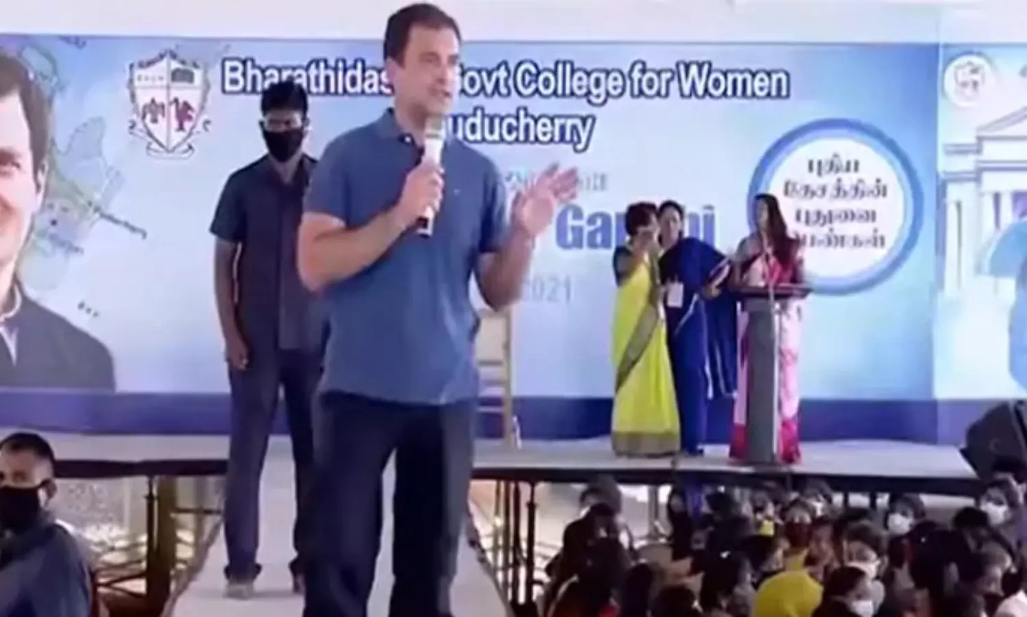 ഭാരതീദാസൻ ഗവൺമെന്റ് കോളജിലായിരുന്നു വിദ്യാർത്ഥികളുമായുള്ള സംവാദം. തന്നെ സാർ എന്നു വിളിക്കരുത് എന്നാവശ്യപ്പെട്ട രാഹുൽ പ്രിൻസിപ്പളിനെയും ടീച്ചർമാരെയും സർ എന്ന് വിളിക്കാനും അഭ്യർത്ഥിച്ചു.