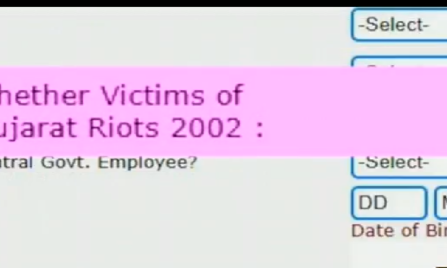 വ്യക്തി വിവരങ്ങളാണ് ഇതില് കേന്ദ്ര സര്ക്കാര് ആവശ്യപ്പെടുന്നത്. പേരും വിലാസവും ഉള്പ്പെടെയുള്ള അടിസ്ഥാന വിവരങ്ങള് നല്കിയാല് പിന്നെ അപേക്ഷകനെ കാത്തിരിക്കുന്ന ചോദ്യം 2002ലെ ഗുജറാത്ത് കലാപത്തിന്റെ ഇരകളാണോയെന്നാണ്. അപേക്ഷയുടെ രണ്ടാം ഘട്ടത്തിലേക്ക് കടക്കാന് ഈ ചോദ്യത്തിന് നിര്ബന്ധമായും ഉത്തരം നല്കണം. 1980-1989 കാലയളവില് ജമ്മുകശ്മീരില് സ്ഥിരതാമസക്കാരനായിരുന്നോയെന്ന ചോദ്യവും അപേക്ഷയിലുണ്ട്. ഗുജറാത്ത് കലാപത്തിന്റെ ഇരകള്ക്ക് കേന്ദ്ര സര്വീസില് പ്രത്യേക ഇളവുകളോ ആനുകൂല്യങ്ങളോ സംവരണമോ സര്ക്കാര് പ്രഖ്യാപിച്ചിട്ടില്ല. പിന്നെ എന്ത് മാനദണ്ഡത്തിന്റെ അടിസ്ഥാനത്തിലാണ് ഇത്തരമൊരു വ്യക്തത അപേക്ഷയോടൊപ്പം ആവശ്യപ്പെട്ടിരിക്കുന്നതെന്ന് വിജ്ഞാപനത്തില്പ്പോലും സൂചിപ്പിച്ചിട്ടില്ല.