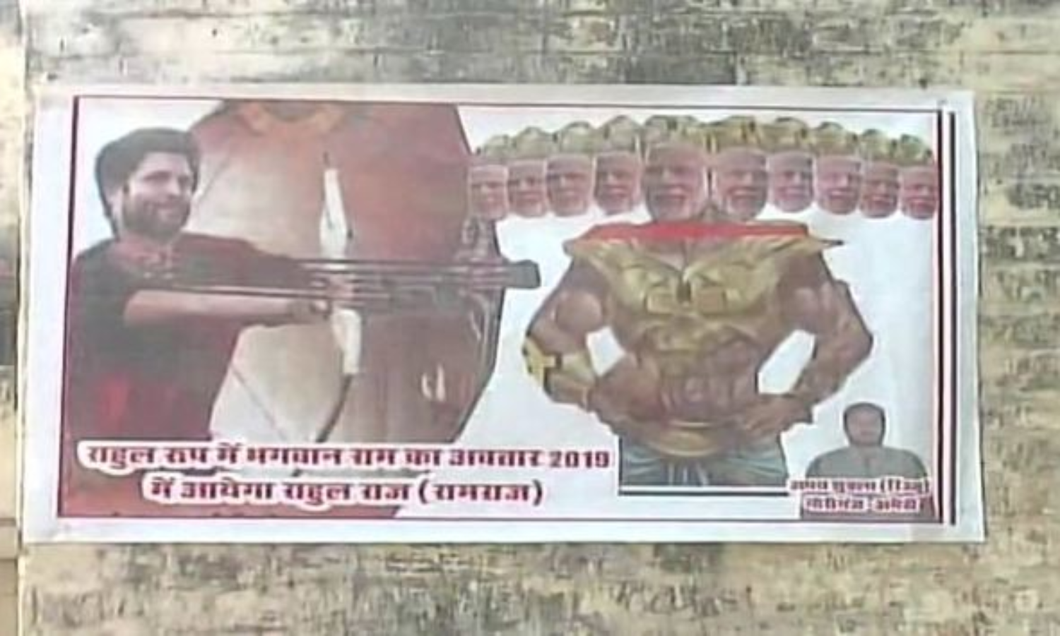 കോണ്ഗ്രസ് അധ്യക്ഷന് രാഹുല് ഗാന്ധിയെ രാമനായും പ്രധാനമന്ത്രി നരേന്ദ്ര മോദിയെ രാവണനായും ചിത്രീകരിച്ച് അമേഠിയില് പോസ്റ്റര്.
