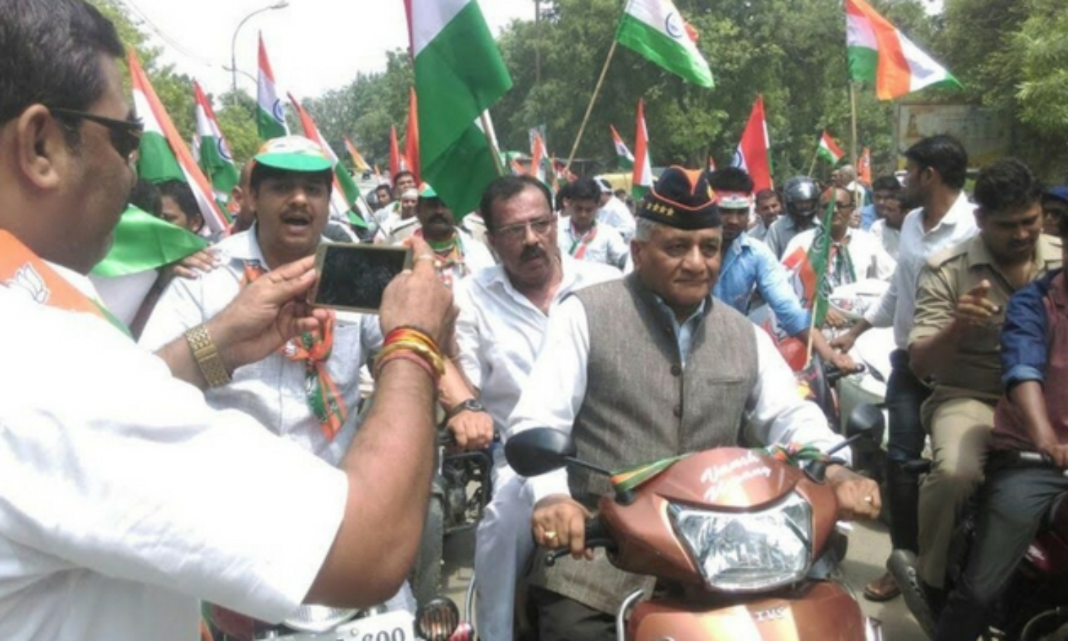 ഹെല്മറ്റില്ലാതെ മന്ത്രി വികെ സിങിന്റെ ബൈക്ക് യാത്ര; സോഷ്യല്മീഡിയ ചോദിക്കുന്നു ഇതാണോ മാതൃക ?