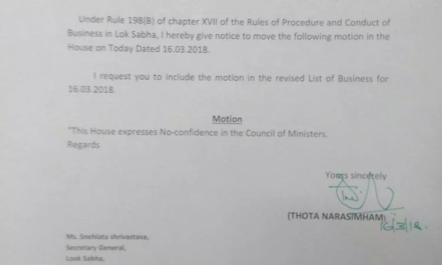 ആന്ധ്രയ്ക്ക് പ്രത്യേകപദവി അനുവദിക്കാത്തതില് പ്രതിഷേധിച്ച് രാഷ്ട്രീയ എതിരാളികളായ വൈഎസ്ആര് കോണ്ഗ്രസ് അവിശ്വാസപ്രമേയത്തിന് നോട്ടീസ് നല്കിയതിന് പിന്നാലെയാണ് ടിഡിപിയും രംഗത്തെത്തിയത്. അവിശ്വാസപ്രേമയത്തിന് അവതരണാനുമതി ലഭിക്കാന് ചുരുങ്ങിയത് 50 അംഗങ്ങളുടെയെങ്കിലും പിന്തുണവേണം. 16 അംഗങ്ങളുള്ള ടിഡിപിയെ നോട്ടീസിനെ പിന്തുണച്ചുകൊണ്ട് കോണ്ഗ്രസ്, ഇടത്പാര്ട്ടികള്, തൃണമൂല് തുടങ്ങിയ പ്രതിപക്ഷ പാര്ട്ടികളെല്ലാം രംഗത്തെത്തി. ഇതിനുപുറമെ പ്രതിസന്ധി ഘട്ടങ്ങളില് ബിജെപിയെ പിന്തുണയ്ക്കാറുള്ള എഐഎഡിഎംകെ, ബിജെഡി തുടങ്ങിയ കക്ഷികളും എന്ഡിഎയിലെ ശിവസേനയും ടിഡിപിയെ പിന്തുണയ്ക്കും.