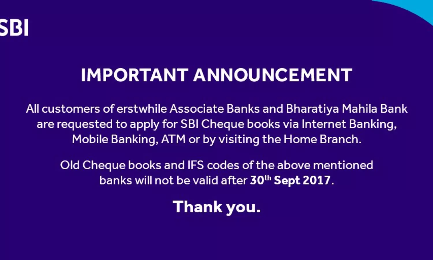 ഒരു ട്വീറ്റ് സന്ദേശത്തിലൂടെയാണ് എസ്ബിഐ ഇക്കാര്യം അറിയിച്ചത്. പഴയ ചെക്ക് ബുക്കുകള് മടക്കി നല്കി പുതിയ ഐഎഫ്സി കോഡോടു കൂടിയ ചെക്ക് ബുക്കുകള് സ്വന്തമാക്കാന് ഉപയോക്താക്കള് ശ്രദ്ധിക്കണമെന്നും അറിയിപ്പ് പറയുന്നു.