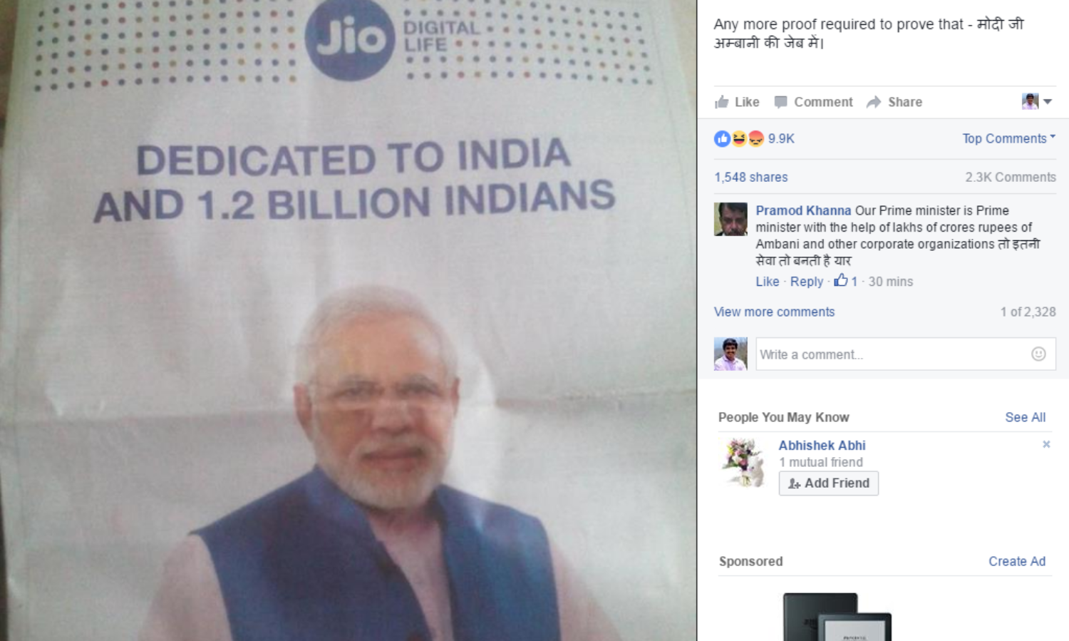 ഇന്ത്യന് പ്രധാനമന്ത്രി റിലയന്സിന്റെ ഉത്പന്നമാണെന്നതിന് ഇതിലും വലിയ തെളിവ് വേണോ എന്ന് ചോദിക്കുന്നത് ഡല്ഹി മുഖ്യമന്ത്രി അരവിന്ദ് കെജ്രിവാളാണ്. തന്റെ ഫേസ്ബുക്ക് പേജിലൂടെയാണ് കെജ്രിവാളിന്റെ മോദിക്ക് നേരെയുള്ള ആക്രമണം. ടൈംസ് ഓഫ് ഇന്ത്യ പത്രത്തില് റിലയന്സ് ജിയോ നല്കിയ ഒന്നാം പേജ് പരസ്യത്തിന്റെ ചിത്രവും കെജ്രിവാള് പോസ്റ്റു ചെയ്തിട്ടുണ്ട്.