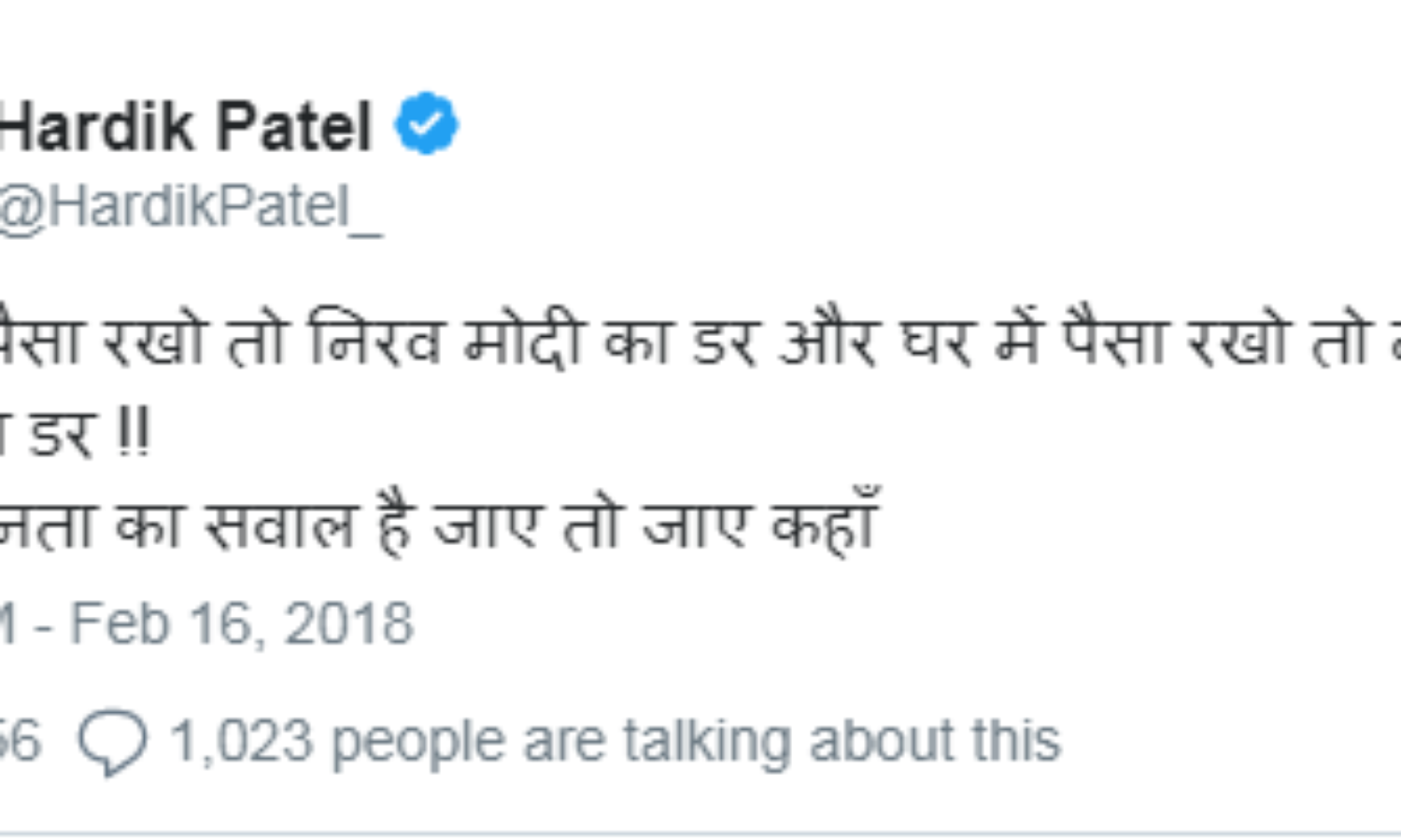 പഞ്ചാബ് നാഷണൽ ബാങ്കിൽനിന്ന് 11,400 കോടി തട്ടിയെടുത്ത് വജ്രവ്യാപാരിയായ നീരവ് മോദി രാജ്യം വിട്ട വിഷയത്തിലാണ് പ്രതികരണവുമായി ഹാർദിക് രംഗത്തെത്തിയത്.