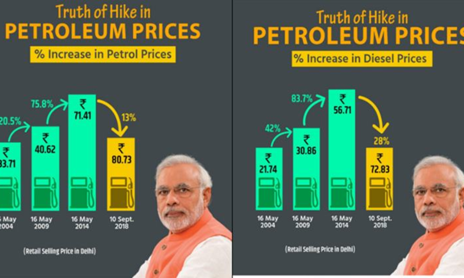 ‘പെട്രോൾ-ഡീസൽ വില വർധനയ്ക്കു പിന്നിലെ യാഥാർത്ഥ്യം’ എന്ന തലക്കെട്ടോടെ പ്രത്യക്ഷപ്പെട്ട ഗ്രാഫ് ചിത്രങ്ങളിലാണ് വെെരുദ്ധ്യങ്ങളും തെറ്റായ ചിത്രീകരണവും കടന്നു കൂടിയിട്ടുള്ളത്. 2009 മുതൽ 2014 വരെയുള്ള കാലയളവിൽ പെട്രോൾ വിലയിൽ 75.8 ശതമാനം വർധനയുള്ളത്, 2014-2018 കാലയളവായപ്പോൾ 13 ശതമാനമായി കുറഞ്ഞു എന്ന് സ്ഥാപിക്കുന്ന ഗ്രാഫ് പക്ഷെ, പെട്രോൾ വില ഇടിഞ്ഞതായാണ് ചിത്രീകരിച്ചിട്ടുള്ളത്. ഇതേ രീതിയിൽ ഡീസൽ വില വർധനവിനെ കുറിച്ചുള്ള ഗ്രാഫിലും സമാന പിഴവാണ് സംഭവിച്ചിരിക്കുന്നത്.