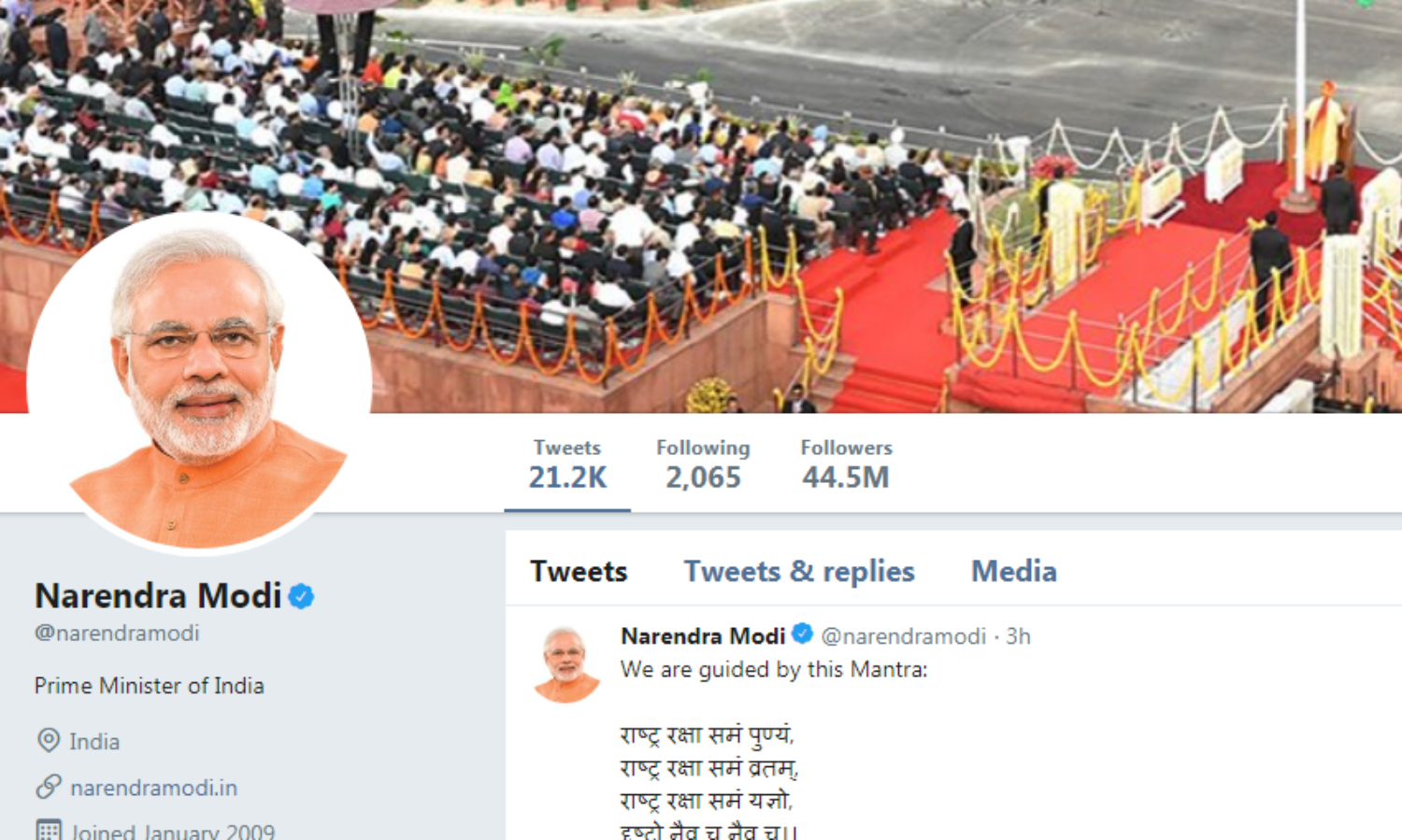 ട്വിറ്ററില് സജീവമാണ് പ്രധാനമന്ത്രി നരേന്ദ്ര മോദി. 4.5 മില്യണ് ആളുകളാണ് പ്രധാനമന്ത്രിയെ ട്വിറ്ററില് പിന്തുടരുന്നത്. 2014 ല് പ്രധാനമന്ത്രി പദത്തില് എത്തുന്നതിന് മുമ്പും ട്വിറ്ററിന്റെ ആശയ വിനിമയ സാധ്യത പരമാവധി ഉപയോഗപ്പെടുത്തിയ ആളാണ് മോദി. മന്മോഹന് സിങിന്റെ നേതൃത്വത്തിലുള്ള യു.പി.എ സര്ക്കാരിനെതിരെ രൂക്ഷമായ വിമര്ശനങ്ങള് ഉന്നയിക്കാനും മോദി തിരഞ്ഞെടുത്തിരുന്നത് ട്വിറ്ററിനെ തന്നെയാണ്.