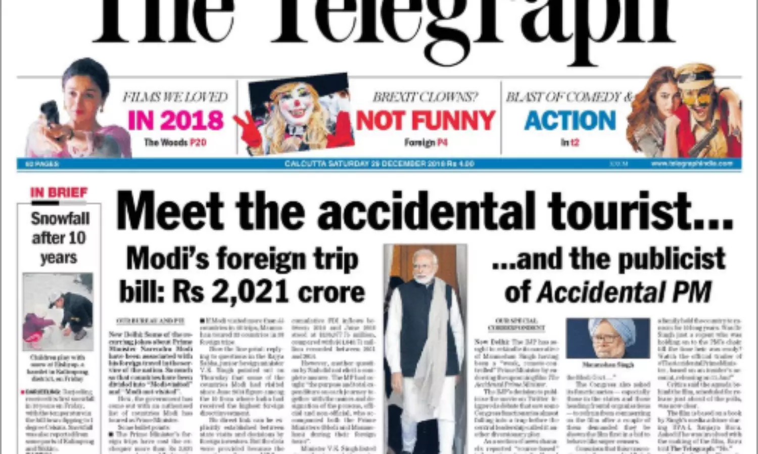 പഞ്ച് തലക്കെട്ടുകള് കൊണ്ട് പ്രസിദ്ധമാണ് കൊല്ക്കത്തയില് നിന്നും പ്രസിദ്ധീകരിക്കുന്ന ദി ടെലിഗ്രാഫ്. മികച്ച തലക്കെട്ടുകള് നല്കി മുന്പും ടെലിഗ്രാഫ് നമ്മെ ഞെട്ടിച്ചിട്ടുണ്ട്. സ്മൃതി ഇറാനിക്കെതിരായ ‘ആന്റി നേഷണലും’, ‘പാട്രിയോട്ട്’ തലക്കെട്ടുകളും പത്രത്തിന്റെ ഒരു മില്യണ് വരിക്കാരെയും കടന്ന് ഫേസ്ബുക്കിലൂടെയും വാട്ട്സ്ആപ്പിലൂടെയും ഏറെ പ്രചരിച്ചവയാണ്. ഇന്നത്തെ ടെലിഗ്രാഫ് തലക്കെട്ടും അതിന്റെ മൂര്ച്ച കൊണ്ടും വിമര്ശനം കൊണ്ടും സാമൂഹിക മാധ്യമങ്ങളില് ഏറെ ചര്ച്ച ചെയ്യപ്പെട്ടവയാണ്. ‘ആക്സിഡന്റല് ടൂറിസ്റ്റി’നെ പരിചയപ്പെടു എന്ന തലക്കെട്ടോടെ പ്രധാനമന്ത്രി നരേന്ദ്ര മോദിയുടെ വിദേശ രാജ്യങ്ങളിലെ സന്ദര്ശനങ്ങളെ കണക്കറ്റം ട്രോളുന്നുണ്ട് തലക്കെട്ടിലൂടെയും തുടര്ന്ന് വരുന്ന വാര്ത്തയിലും. 2021 കോടി രൂപയാണ് മോദി വിദേശ സന്ദര്ശനങ്ങള്ക്കായി ചെലവിട്ടത്. ഇത് ഒരു ഭാഗത്ത് വിശദീകരിക്കുന്ന ടെലിഗ്രാഫ് നേര് മറുഭാഗത്ത് ആക്സിഡന്റല് പിഎമ്മിന്റെ പ്രചാരകനാക്കി മാറ്റപ്പെട്ട മന്മോഹന് സിങിനേയും കോണ്ഗ്രസിനേയും കൊണ്ടുവരുകയും ചെയ്യുന്നുണ്ട്. ദി ആക്സിഡന്റല് പി.എം എന്ന ബോളിവുഡ് ചിത്രത്തെ ബി.ജെ.പി ആഘോഷിക്കുന്നതിനെ വിമര്ശന വിധേയമാക്കുകയും പരിഹസിക്കുകയുമാണ് ടെലഗ്രാഫ് തലക്കെട്ടിലൂടെ.