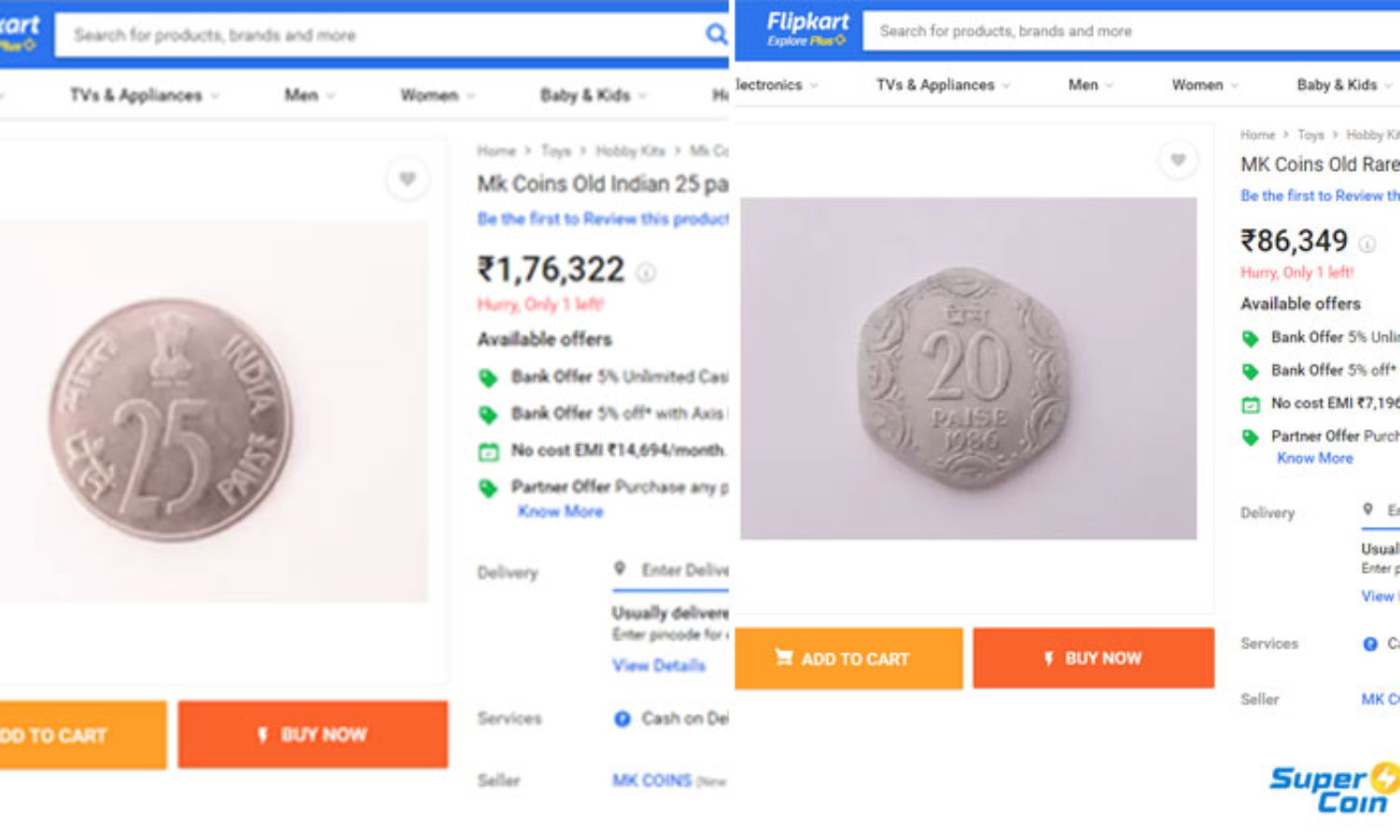 1984 ല് പുറത്തിറക്കിയ 10 പൈസ നാണയത്തിന് ഫ്ലിപ്പ്കാര്ട്ടില് 50 ശതനാനം ഓഫര് കഴിച്ച് 99 രൂപ നല്കിയാല് മതി. 1968 ലെ 5 പൈസ നാണയത്തിനും സമാന വിലയാണ്. പഴയ ഇന്ത്യൻ നാണയങ്ങൾ ഇക്കാലത്ത് അപൂർവമാണെന്നും 1986ലെ 20 പൈസ നാണയത്തിന് ഏറെ ആവശ്യക്കാരുണ്ടെന്നുമാണ് ഉത്പന്നത്തെ കുറിച്ചുള്ള വിവരണത്തിലെ അവകാശവാദം. ഇത്നാണയ ശേഖരത്തിൽ ഉൾപ്പെടുത്തുകയോ നാണയ ശേഖരണം ശീലമുള്ള സുഹൃത്തുക്കൾക്ക് സമ്മാനമായി നൽകുകയോ ചെയ്യാമെന്നും നിർദേശിക്കുന്നുണ്ട്. നിര്മ്മാണം 1997 ല് നിര്ത്തിയിരുന്നെങ്കിലും 2011 ലാണ് 10, 20, 25 നാണയങ്ങള് ഔദ്യോഗികമായി റിസര്വ് ബാങ്ക് പിന്വലിച്ചത്.