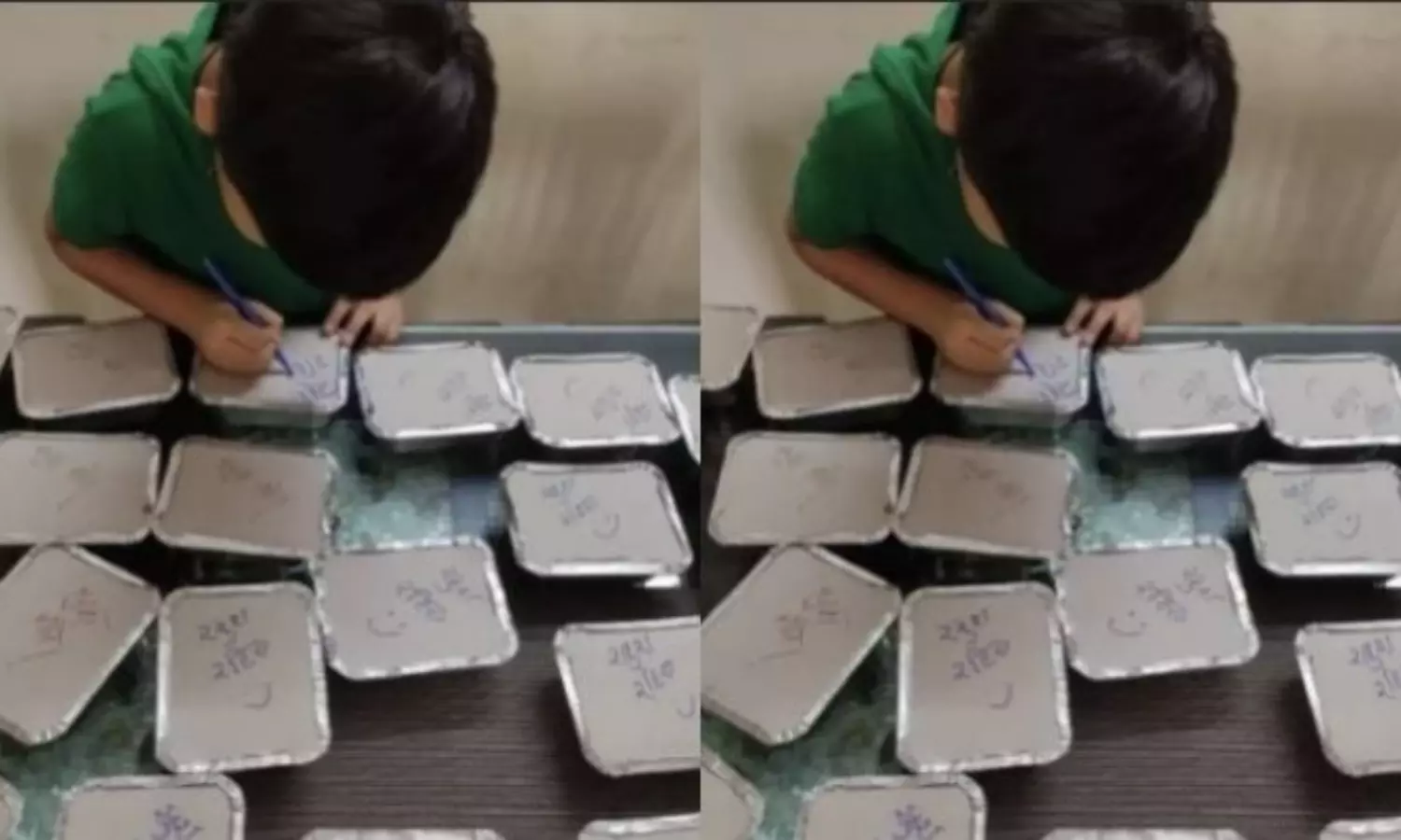 കോവിഡ് രോഗികള്‍ക്കായി അമ്മ തയ്യാറാക്കിയ ഭക്ഷണപ്പൊതിയില്‍ 'ഖുഷ് രഹിയേ' സന്തോഷമായിരിക്കൂ എന്നാണ് അവന്‍ കുറിക്കുന്നത്. ഓരോ പൊതിയിലും പേന കൊണ്ട് എഴുതുകയാണ് ഈ മിടുക്കന്‍. ''ഈ കുട്ടിയുടെ അമ്മ കോവിഡ് രോഗികള്‍ക്കായി ഭക്ഷണം പാകം ചെയ്യുന്നു, ഓരോ ബോക്സിലും ഈ കൊച്ചുകുട്ടി സന്തോഷമായിരിക്കാന്‍ എഴുതുന്നു''. .. എന്ന അടിക്കുറിപ്പോടെ മനീഷ് സാരംഗല്‍ എന്നയാളാണ് ചിത്രം പങ്കുവച്ചിരിക്കുന്നത്. പച്ച നിറത്തിലുള്ള ടീ ഷര്‍ട്ട് ധരിച്ച കുട്ടി മീല്‍സ് ബോക്സില്‍ പേന കൊണ്ട് എഴുതുകയാണ്.