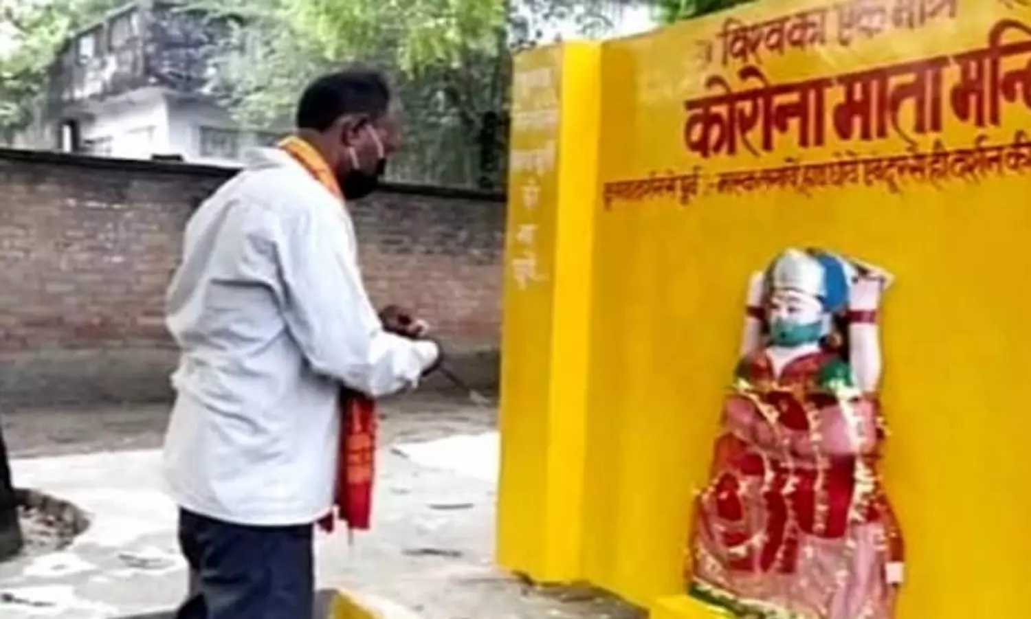 രാജ്യത്ത് കോവിഡ് രണ്ടാം തരംഗം വ്യാപിക്കുന്നതിനിടെയാണ് വൈറസ് ബാധയില് നിന്നും രക്ഷ നേടാനെന്ന പേരില് പ്രതാപ്ഗഢ് ജില്ലയിലെ ശുക്ലാപൂരില് 'കൊറോണ മാതാ' ക്ഷേത്രം പണി കഴിപ്പിക്കുന്നത്. ക്ഷേത്രംപണിത് വിരലിലെണ്ണാവുന്ന ദിവസങ്ങളേ ആയുള്ളൂവെങ്കിലും നൂറുകണക്കിന് ഗ്രാമീണരാണ് കഴിഞ്ഞ ദിവസങ്ങളിലായി ഇവിടെ പ്രാര്ത്ഥനക്കെത്തിയിരുന്നത്. കോവിഡിന്റെ നിഴല് ശുക്ലാപൂരിലും സമീപ ഗ്രാമങ്ങളിലും വീഴാതിരിക്കാനാണ് ക്ഷേത്രം സ്ഥാപിച്ചതെന്നാണ് സ്ഥാപിച്ചവര് അവകാശപ്പെട്ടിരുന്നത്. 'കൊറോണ' മാത എന്ന മാസ്ക് ധരിച്ച വിഗ്രഹത്തെയാണ് ഇവിടെ പ്രതിഷ്ഠിച്ചിരുന്നത്.