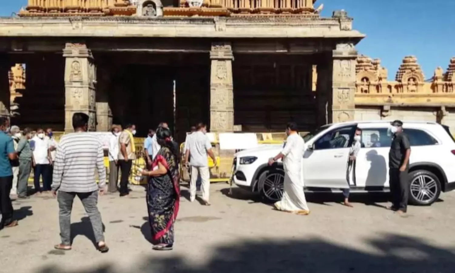 കർണാടക മുഖ്യമന്ത്രിയുടെ മകൻ ബിവൈ വിജയേന്ദ്രയാണ് യാത്രാവിലക്കുകൾ മറികടന്ന് ഭാര്യയ്ക്കൊപ്പം നഞ്ചൻഗുഡ് ശ്രീകണ്ഠേശ്വര ക്ഷേത്രം സന്ദർശിച്ചത്
