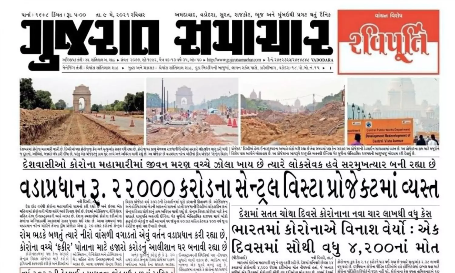 'മോദി 22,000 കോടിയുടെ സെൻട്രൽ വിസ്ത പദ്ധതിയുമായി തിരക്കിലാണ്'; ചർച്ചയായി ഗുജറാത്ത് സമാചാർ ഒന്നാം പേജ്