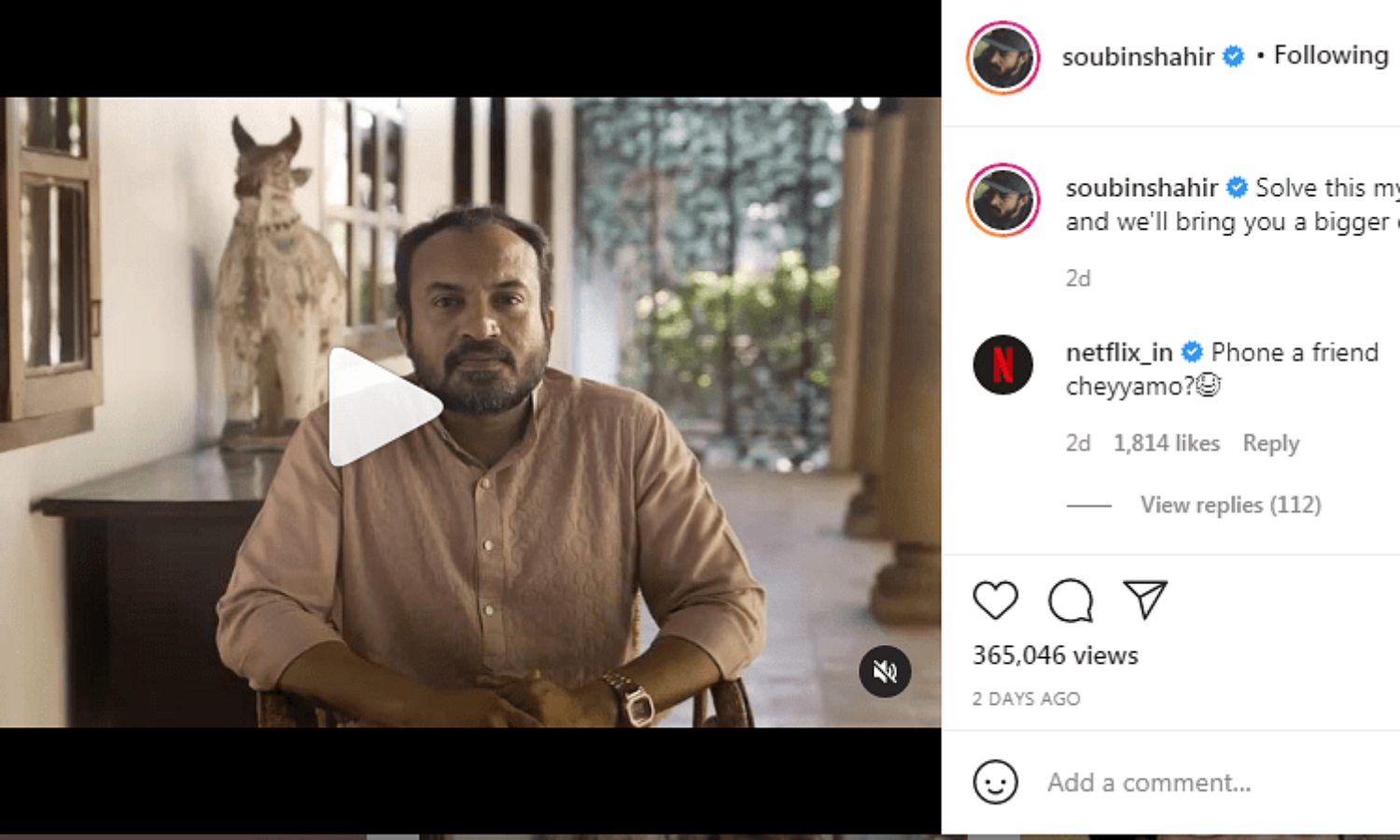 നടന് സൗബിന് ഷാഹിറിന്റെ ഇന്സ്റ്റഗ്രാം പോസ്റ്റിന് താഴെ നെറ്റ്ഫ്ലിക്സ് ഇട്ട ഒരു കമന്റാണ് സോഷ്യല്മീഡിയയില് കൌതുകമായിരിക്കുന്നത്.