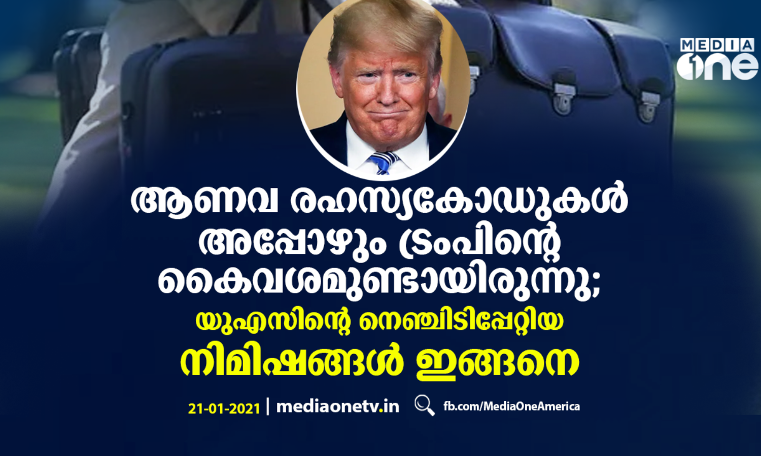 യുഎസിനെ ഉദ്വേഗത്തിന്റെ മുള്മുനയില് നിര്ത്തിയാണ് ന്യൂക്ലിയര് ഫുട്ബോള് എന്നറിയപ്പെടുന്ന അണ്വായുധങ്ങളുടെ രഹസ്യകോഡുകള് ട്രംപ് കൂടെക്കൊണ്ടുപോയത്