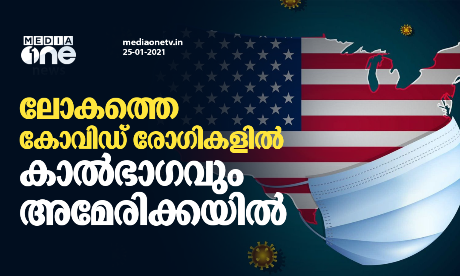 അമേരിക്കയിലെ കോവിഡ് രോഗികളുടെ എണ്ണം രണ്ടര കോടി കഴിഞ്ഞു. ജോൺസ് ഹോപ്കിൻസ് യൂണിവേഴ്സിറ്റിയുടെ കണക്കുകൾ പ്രകാരം ലോകത്തെ കോവിഡ് രോഗികളിൽ കാൽ ഭാഗവും അമേരിക്കയിലാണ്. മുൻ അമേരിക്കൻ പ്രസിഡന്റ് ഡൊണാൾഡ് ട്രംപിന്റെ കീഴിൽ വാക്സിൻ വിതരണം അവതാളത്തിലായിരുന്നുവെന്നു യു.എസ് പ്രസിഡന്റ് ബൈഡന്റെ ചീഫ് ഓഫ് സ്റ്റാഫ് റോൺ ക്ലെയ്ൻ പറഞ്ഞു.