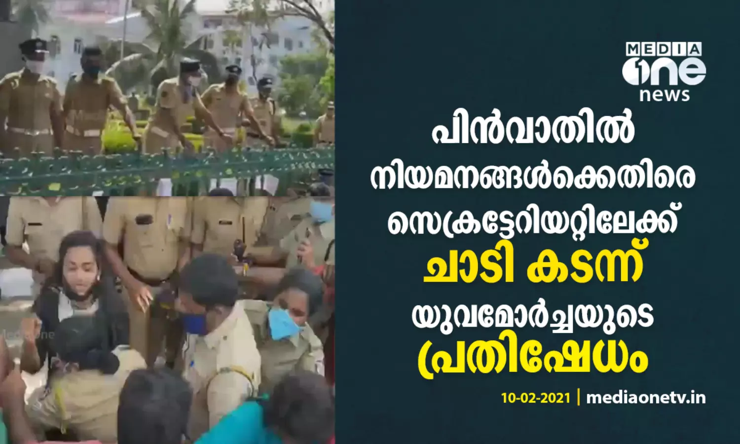 പിന്വാതില് നിയമനങ്ങള്ക്കെതിരെ സെക്രട്ടേറിയറ്റിലേക്ക് ചാടിക്കടന്ന് യുവമോര്ച്ചയുടെ പ്രതിഷേധം