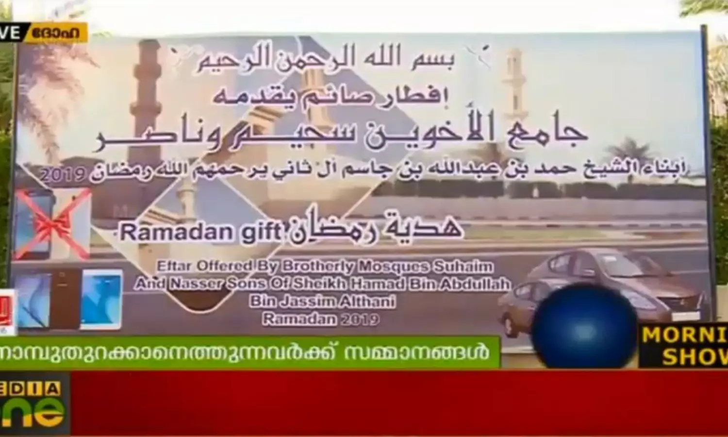 ഖത്തറിലെ അല്വാബില് റോഡരികില് കാണുന്ന കൂറ്റന് പരസ്യബോര്ഡ് ആരെയും ആകര്ഷിക്കുന്നതാണ്. ഇഫ്ത്താറിനെത്തുന്നവര്ക്ക് കാറും മൊബൈലുമൊക്കെ സമ്മാനം നല്കുന്നുവെന്നാണ് ബോര്ഡില് കണ്ടതിന്റെ മലയാളം. നേരെ പിറകിലുള്ള ജാമിഉല് അഖവൈന് പള്ളിയിലെത്തിയാല് മുറ്റത്ത് നിര്ത്തിയിട്ട പുത്തന് നിസാന് കാര് കാണാം. പള്ളിക്ക് മുന്നിലായി സ്ഥാപിച്ച കൂറ്റന് റംസാന് തമ്പില് ഇഫ്താറിനുള്ള വിഭവങ്ങളൊരുക്കുകയാണ്. വിഭവസമൃദ്ധമായ ഭക്ഷണത്തിനൊപ്പം ഒരു കൂപ്പണും വെക്കും. നമസ്കാരവും നോമ്പുതുറയും കഴിഞ്ഞാല് പിന്നെ നറുക്കെടുപ്പാണ്. നോമ്പ് കഴിയുന്നത് വരെ ഓരോ ദിവസവും മൊബൈല് ഫോണോ ടാബ്ലറ്റോ ആണ് സമ്മാനമായി നല്കുന്നത്. ബമ്പര് സമ്മാനമായ നിസ്സാന് സണ്ണി കാറിനുള്ള നറുക്കെടുപ്പ് അവസാന നോമ്പിനാണ്. രാജകുടുംബാംഗമായ ശൈഖ് ഹമദ് ബിന് അബ്ദുള്ള ബിന് ജാസിം അല്ത്താനിയുടെ കുടുംബ പള്ളിയാണിത്. മകന് ഖാലിദുബ്നും ശുഐം അല്ത്താനിയാണിപ്പോള് ഈ രീതിയിലുള്ള നോമ്പുതുറയ്ക്ക് നേതൃത്വം നല്കുന്നത്.