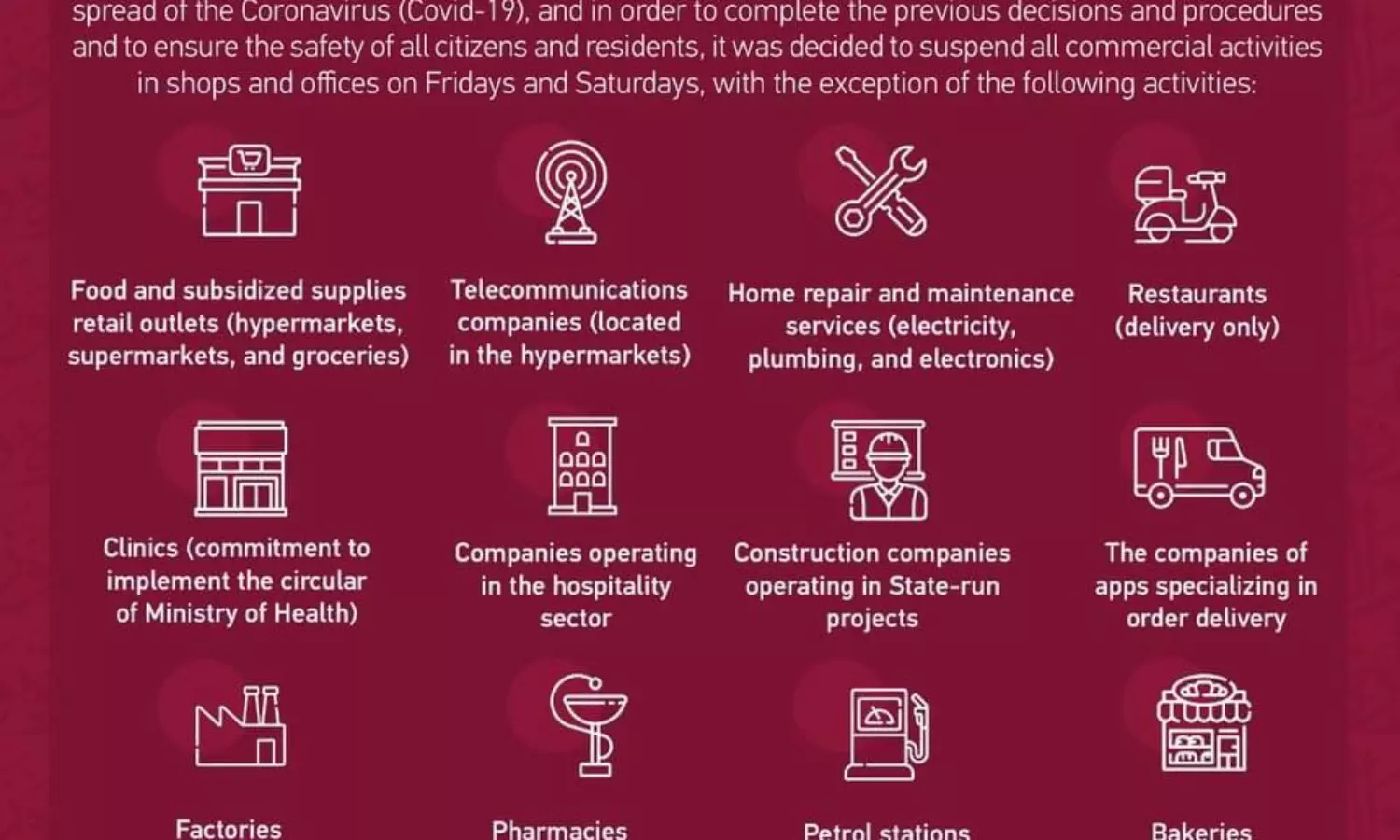 ഭക്ഷ്യ വസ്തുക്കള് ലഭിക്കുന്ന കേന്ദ്രങ്ങള് (സൂപ്പര്മാര്ക്കറ്റുകള്, ഹൈപ്പര്മാര്ക്കറ്റുകള്, ഗ്രോസറികള്) ഭക്ഷ്യ വിഭവങ്ങള് പാര്സല് നല്കുന്ന റസ്റ്റോറന്റുകള്, ഫാര്മസികള്, പെട്രോള് പമ്പുകള്, ഹൈപ്പര്മാര്ക്കറ്റുകളിലുള്ള ടെലികമ്മ്യൂണിക്കേഷന് കമ്പനികള്, വീടുകളിലെ അറ്റകുറ്റപ്പണികള്ക്കുള്ള സര്വീസുകള് (ഇലക്ട്രിസിറ്റി,ഇലക്ട്രോണിക്, പ്ലംബിങ്),ലോജിസ്റ്റിക്സ് കമ്പനികള്, കംസ്റ്റസ് ക്ലിയറന്സുമായി ബന്ധപ്പെട്ട വിഭാഗങ്ങള് തുടങ്ങിയവ മാത്രമേ ഈ ദിവസങ്ങളില് പ്രവര്ത്തിക്കൂ. ഞായര് മുതല് വെള്ളി വരെയുള്ള ദിവസങ്ങളില് കൂടുതല് അവശ്യസേവന കേന്ദ്രങ്ങള് തുറന്നുപ്രവര്ത്തിക്കും.