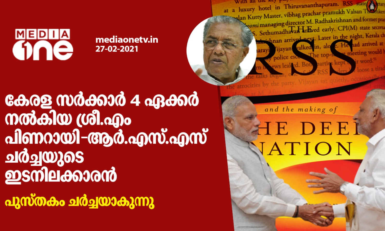 അവസാന മന്ത്രിസഭാ യോഗത്തിൽ കേരള സർക്കാർ തിരുവനന്തപുരം നഗരത്തിൽ 4 ഏക്കർ ഭൂമി നൽകിയ ശ്രീ എം, പിണറായി-ആർ.എസ്.എസ് ചർച്ചയുടെ ഇടനിലക്കാരനായി വെളിപ്പെടുത്തല്. പിണറായി വിജയനും കോടിയേരി ബാലകൃഷ്ണനും അതീവ രഹസ്യമായി ആർ.എസ്.എസ് നേതാക്കളായ ഗോപാലൻകുട്ടി മാസ്റ്റർ, വൽസൻ തില്ലങ്കേരി എന്നിവരുമായി നടത്തിയ രഹസ്യ കൂടിക്കാഴ്ചക്ക് ശ്രീ എം മധ്യസ്ഥത വഹിച്ചുവെന്ന വിവരം മലയാളി മാധ്യമ പ്രവർത്തകകനാണ് പുറത്തുവിട്ടത്. ഇകണോമിക് ടൈംസ് ഡൽഹി ലേഖകനും മലയാളിയുമായ ദിനേഷ് നാരായണൻ രചിച്ച 'The RSS And The Making of The Deep Nation എന്ന, പെൻഗ്വിൻ ബുക്സ് പ്രസിദ്ധീകരിച്ച പുസ്തകത്തിലൂടെയാണ് ഈ വിവരം പുറത്തുവന്നത്. കഴിഞ്ഞ ഫെബ്രുവരിയിൽ പ്രസിദ്ധീകരിച്ച പുസ്തകം, ശ്രീ എമ്മിന് കേരള സർക്കാർ സൗജന്യ ഭൂമി നൽകിയത് വിവാദമായതോടെയാണ് കേരളത്തിൽ ചർച്ചയാകുന്നത്. 1987 ല് ഇ.കെ നായനാർ സർക്കാർ അധികാരത്തിലെത്താന് ആര്.എസ്.എസ് പരോക്ഷമായി സഹായിച്ചതായും പുസ്തകത്തില് പറയുന്നുണ്ട്.