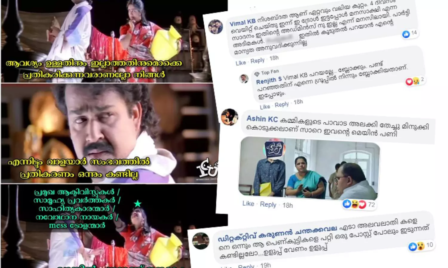 വൈകീട്ട് ഏഴു മണിക്കു ശേഷം പേജിലെത്തിയ അടുത്ത ട്രോളിലും വാളയാറിലെ പൊലീസ് വീഴ്ചയെക്കുറിച്ച് ഒന്നുമുണ്ടായിരുന്നില്ല. അതിനിടെ, എന്തുകൊണ്ടാണ് പേജിൽ വാളയാർ സംബന്ധിച്ച് ട്രോൾ വരാത്തത് എന്ന ചോദ്യത്തിന് പേജ് അഡ്മിൻ ആയ റോഷൻ തോസിന്റെ മറുപടി ഇപ്രകാരമായിരുന്നു.