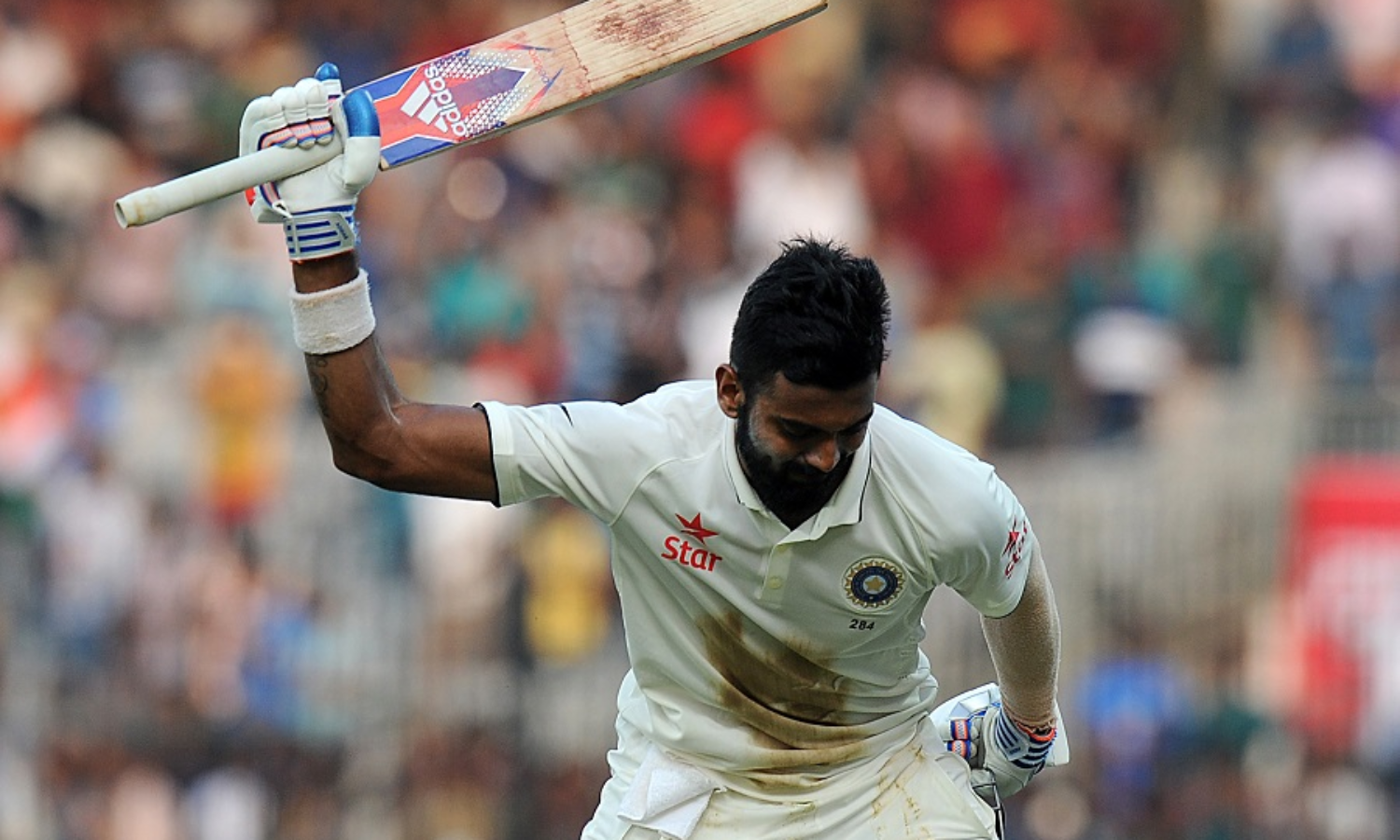 ടെസ്റ്റ് ക്രിക്കറ്റില് ഇരട്ട സെഞ്ചുറിക്ക് ഒരു റണ് അകലെ പുറത്താകുന്ന ഒമ്പതാമത്തെ ബാറ്റ്സ്മാനാണ് രാഹുല്. സ്റ്റീവ്വോ, സനത് ജയസൂര്യ, മുഹമ്മദ് അസറുദീന്, യൂനിസ് ഖാന് എന്നിവരൊക്കെ നേരത്തെ തന്നെ പട്ടികയില് ഇടംപിടിച്ച താരങ്ങളാണ്. രാഹുലിനെ കൂടാതെ പാര്ത്ഥീവ് പട്ടേലും കരുണ് നായരും അര്ധസെഞ്ച്വറി നേടി. പാര്ത്ഥീവ് 71 റണ്സെടുത്തു. കരുണ് 70 റണ്സുമായി പുറത്താകാതെ ക്രീസിലുണ്ട്. അതെസമയം പൂജാര 16ഉം നായകന് വിരാട് കോഹ്ലി 15ഉം റണ്സെടുത്തു പുറത്തായി. ഇംഗ്ലണ്ടിനായി ബ്രോഡ്, മൊയീന് അലി, ബെന് സ്റ്റോക്ക്, ആദില് റഷീദ് എന്നിവര് ഒരോ വിക്കറ്റ് വീതം വീഴ്ത്തി.