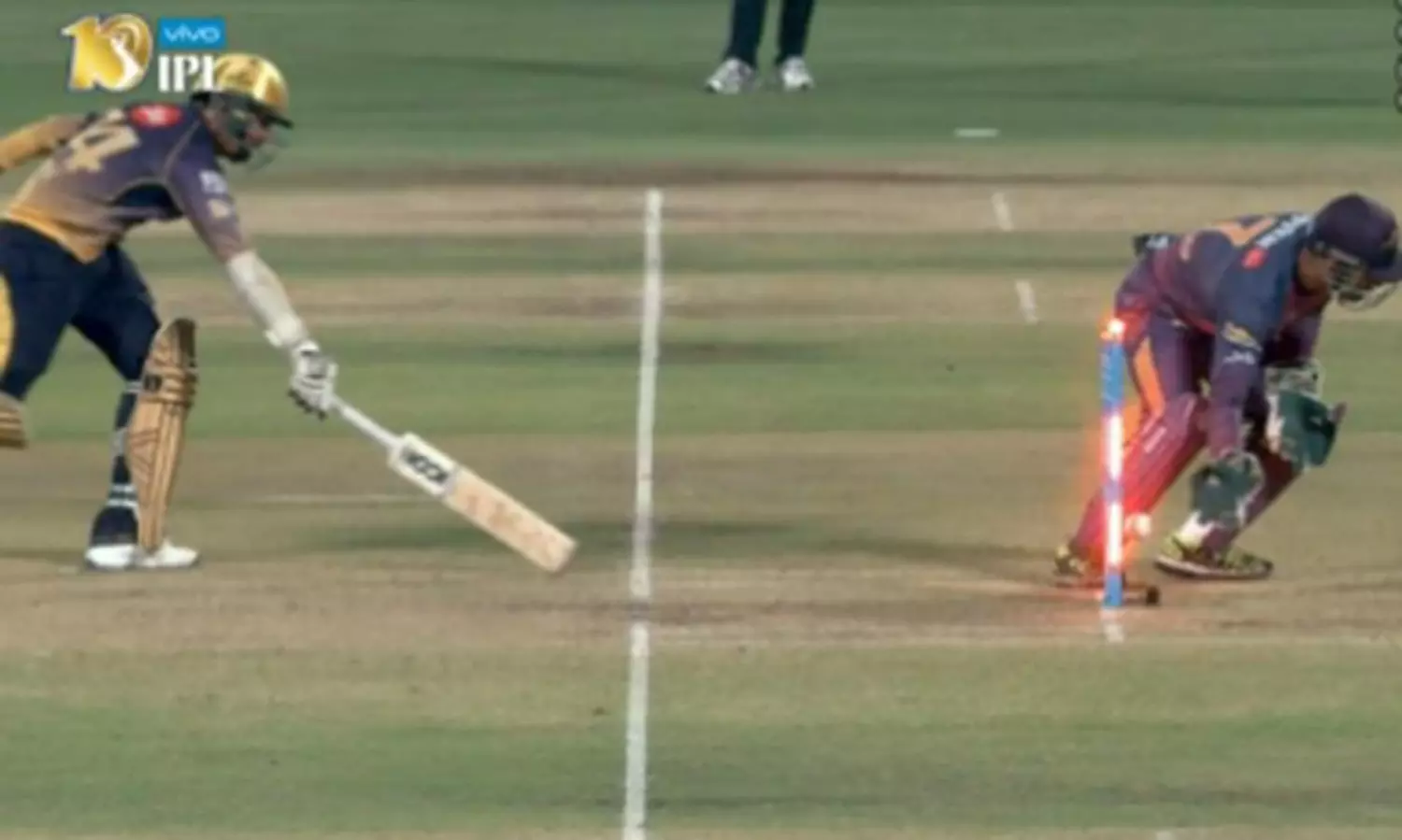 കൊല്ക്കൊത്ത ഇന്നിങ്സിലെ മൂന്നാം ഓവറിലായിരുന്നു ധോണിയുടെ അസാമാന്യ പ്രകടനം. സുന്ദറിന്റെ പന്ത് ലെഗിലേക്ക് തിരിച്ച ഗംഭീര് റണ്സിനായി ഓടി. പന്ത് ക്ഷണനേരത്തില് പിടിച്ചെടുത്ത ശാര്ദുള് ഠാക്കൂര് വിക്കറ്റ് കീപ്പറെ ലക്ഷ്യമാക്കി എറിഞ്ഞു. സ്റ്റന്പിനോട് പിന് തിരിഞ്ഞ് നില്ക്കുകയായിരുന്ന ധോണി പതിവ് ശൈലിയില് പന്ത് വിക്കറ്റിലേക്ക് തിരിച്ചു വിട്ടു. ഓപ്പണറായി ഇറങ്ങി എതിരാളികളെ വട്ടംകറക്കുന്നത് പതിവാക്കിയ സുനില് നരൈന് ഈ സമയം ക്രീസില് നിന്നും ബഹുദൂരം അകലെയായിരുന്നു. ഗംഭീറിന് തുണയായി പിന്നീട് ക്രീസിലെത്തിയ ഉത്തപ്പ പൂനൈയെ അടിച്ചുപരത്തി ടീമിനെ അനായാസ ജയത്തിലേക്ക് നയിച്ചു.