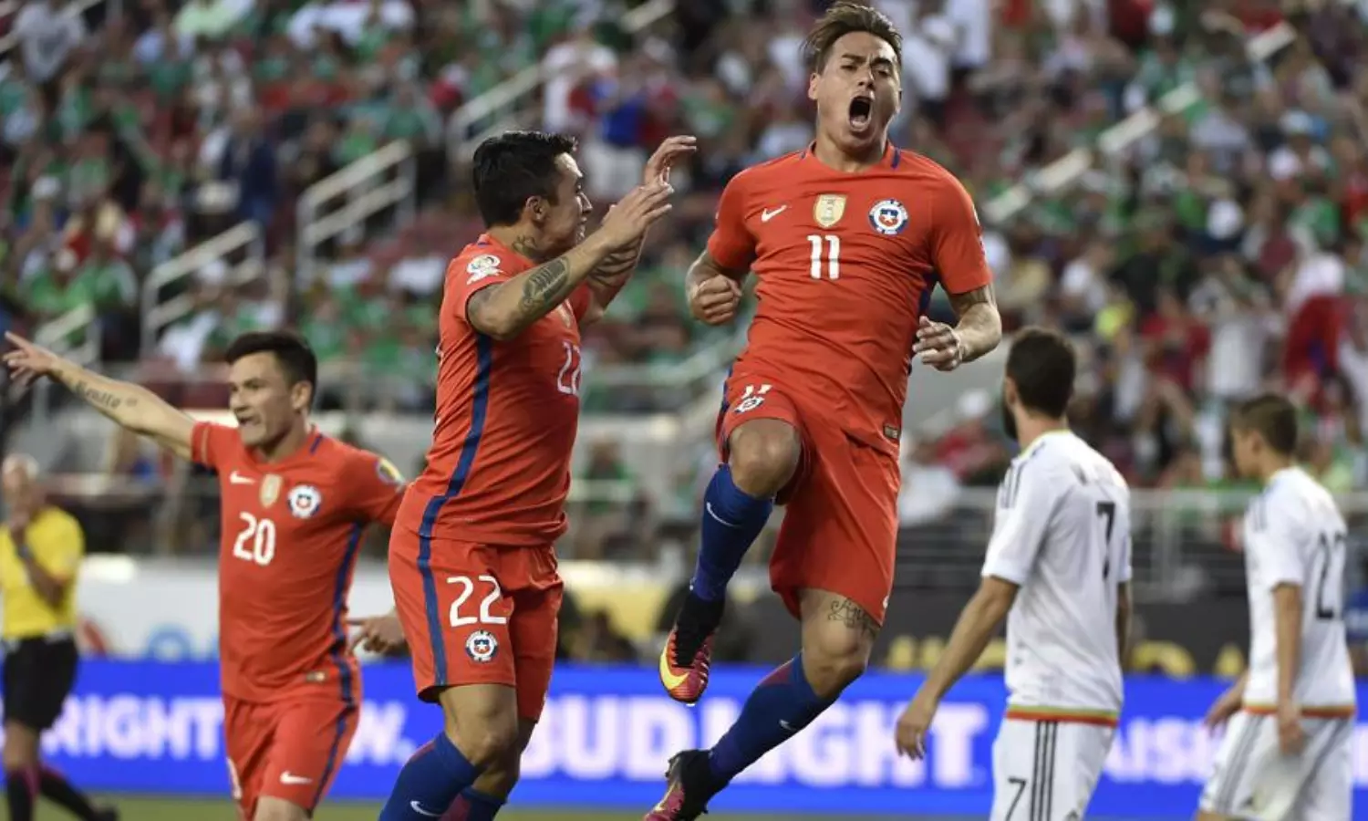 നാലു ഗോളുകളുമായി എഡ്വേര്ഡോ വര്ഗാസും രണ്ടു ഗോള് നേടി എഡ്സണ് പുഞ്ചും, ഒരു ഗോളുമായി അലക്സി സാഞ്ചസും ചിലിയുടെ പടയോട്ടത്തിന്റെ പടയാളികളായി. 16-ാം മിനിറ്റിലാണ് എഡ്സണ് പുഞ്ച് ചിലിയുടെ ഗോള് വേട്ടക്ക് തുടക്കമിട്ടത്. കളിയുടെ 44-ാം മിനിറ്റില് ആദ്യ ഗോള് നേടിയ വര്ഗാസാകട്ടെ 52, 57, 74 മിനിറ്റുകളിലും മെക്സിക്കന് ഗോള് മുഖത്ത് വിള്ളല് വീഴ്ത്തി. സെമിയില് കൊളംബിയയാണ് ചിലിയുടെ എതിരാളി.