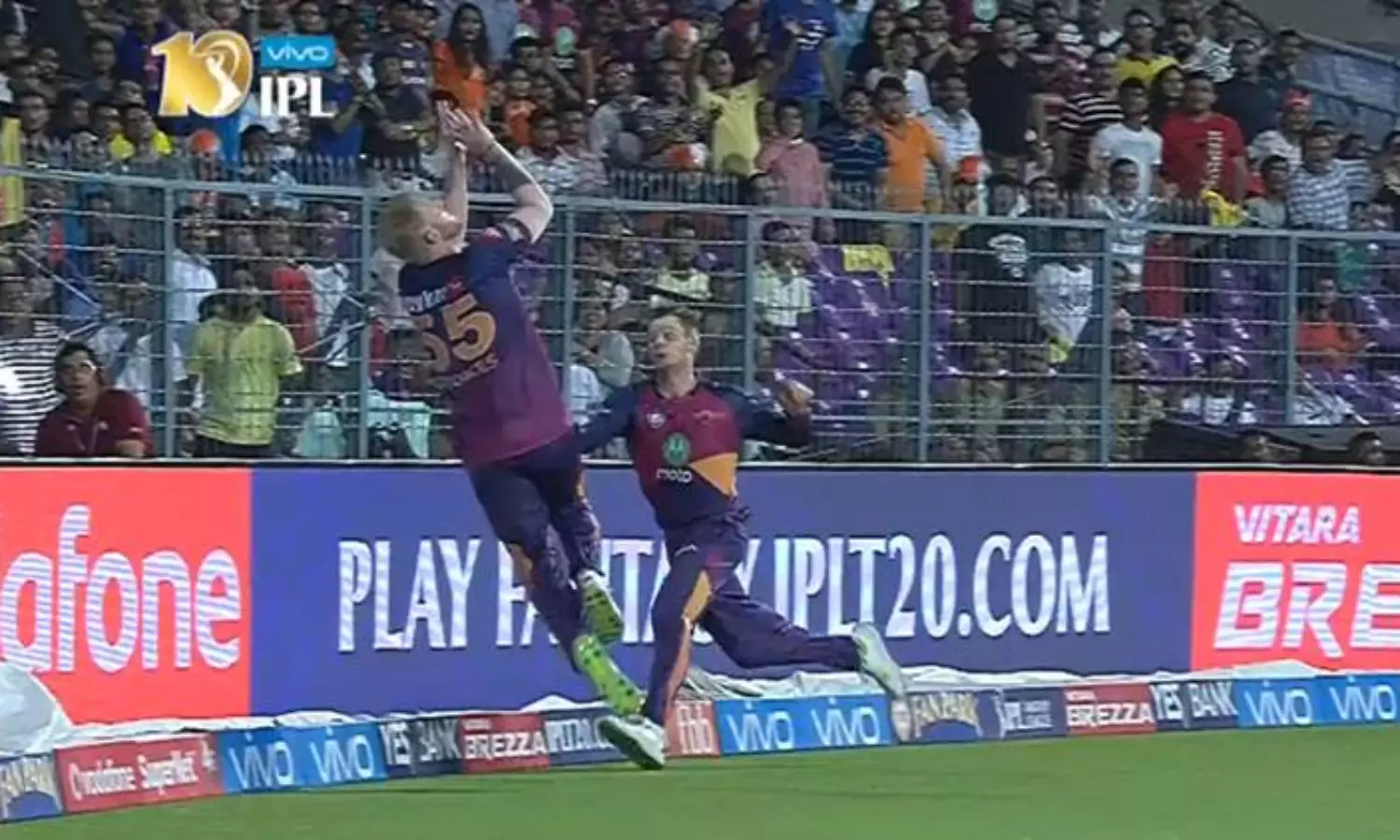 ട്വന്റി 20 പ്രചാരത്തിലായതോടെ ബൗണ്ടറി ലൈനോട് ചേര്ന്ന് പറന്നു കൊണ്ടുള്ള ഫീല്ഡിംങ് പ്രകടനങ്ങള് നിരന്തരം സംഭവിക്കുന്നുണ്ട്. എന്നാല് ഇത്തരം പ്രകടനങ്ങളുടെ അപകട സാധ്യതയാണ് റൈസിംങ് പൂനെ സൂപ്പര് ജയന്റ്സ് താരങ്ങള് തമ്മില് ബൌണ്ടറി ലൈനിന് മുകളില് നടന്ന കൂട്ടിയിടി കാണിക്കുന്നത്. പൂനെ ക്യാപ്റ്റന് സ്മിത്തും ബെന് സ്റ്റോക്സുമാണ് മത്സരത്തിനിടെ ബൗണ്ടറി ലൈനില് കൂട്ടിയിടിച്ചു വീണത്.