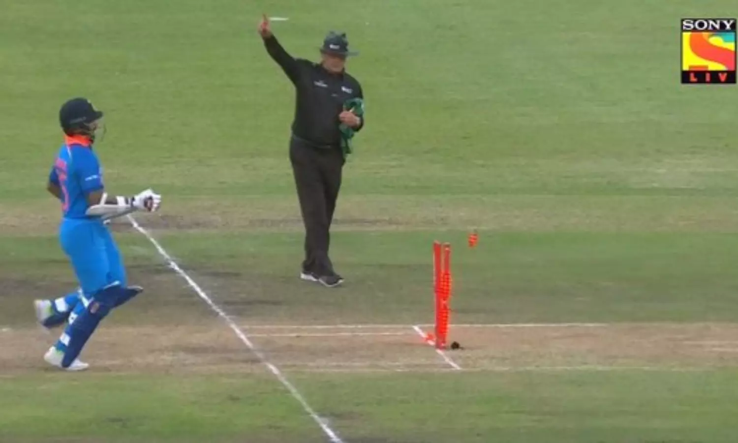 ക്രിസ് മോറിസ് എറിഞ്ഞ പന്ത്രണ്ടാം ഓവറിലെ രണ്ടാം പന്തിലായിരുന്നു ആ റണ്ണൗട്ട്. ഫുള് ലെഗ്തില് വന്ന പന്തില് ക്രിസ് മോറിസ് എല്ബി അപ്പീല് നടത്തുന്നുണ്ടായിരുന്നു. ഒരു നിമിഷം പന്തെവിടെയെന്ന് ധവാന് തിരയുമ്പോഴേക്കും കോഹ്ലി പകുതി ദൂരം പിന്നിട്ടിരുന്നു. ഇതോടെ ഓടുകയല്ലാതെ മറ്റൊരു മാര്ഗ്ഗം ധവാന് മുന്നിലുണ്ടായില്ല. കുതിച്ചെത്തിയ ഐഡന് മര്ക്രാമിന്റെ ഏറില് നോണ് സ്ട്രൈക്കേഴ്സ് എന്ഡിലെ വിക്കറ്റ് തെറിക്കുമ്പോഴും ക്രീസിലെ പകുതി ദൂരം മാത്രമേ ധവാന് പിന്നിട്ടിരുന്നുള്ളൂ. ഔട്ടായതിന് പിന്നാലെ കോഹ്ലിയുടെ ഇല്ലാത്ത റണ്ണിനായുള്ള ഓട്ടത്തിനോട് ദേഷ്യത്തില് കയ്യുയര്ത്തി പ്രതികരിച്ച ശേഷമാണ് ധവാന് ക്രീസ് വിട്ടത്.