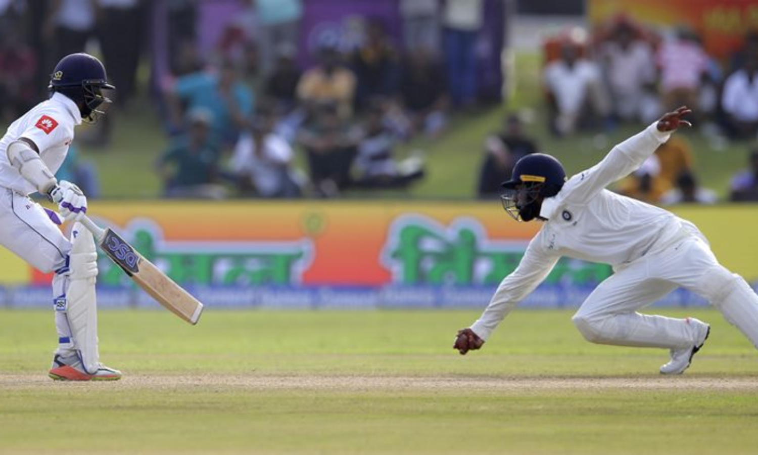 തരംഗയായിരുന്നു മുകുന്ദിന്റെ ഫീല്ഡിലെ ചുറുചുറുക്കിന്റെ ആദ്യ ഇര. അശ്വിന്റെ പന്ത് ക്രീസ് വിട്ട് അടിക്കാന് ശ്രമിച്ച തരംഗക്ക് പക്ഷേ ഉദ്ദേശിച്ച രീതിയില് ആക്രമണം നടത്താനായില്ല. പന്ത് പതുക്കെ സില്ലി പോയിന്റിലേക്ക് തള്ളിവിടാന് മാത്രമാണ് താരത്തിന് സാധിച്ചത്. പന്ത് പിടിച്ച് ഉടന് തന്നെ മുകുന്ദ് ഇത് കീപ്പര് സാഹക്ക് എറിഞ്ഞു കൊടുത്തു. സാഹയാകട്ടെ സ്റ്റമ്പ് ഇളക്കുകയും ചെയ്തു. മുഴുനീള ഡൈവ് ചെയ്ത തരംഗയുടെ ബാറ്റ് ക്രീസിലെത്തിയെങ്കിലും വായുവിലായിരുന്നു. നിരവധി തവണ റീപ്ലേ പരിശോധിച്ച മൂന്നാം അമ്പയര് ഔട്ട് വിധിക്കുകയും ചെയ്തു.
