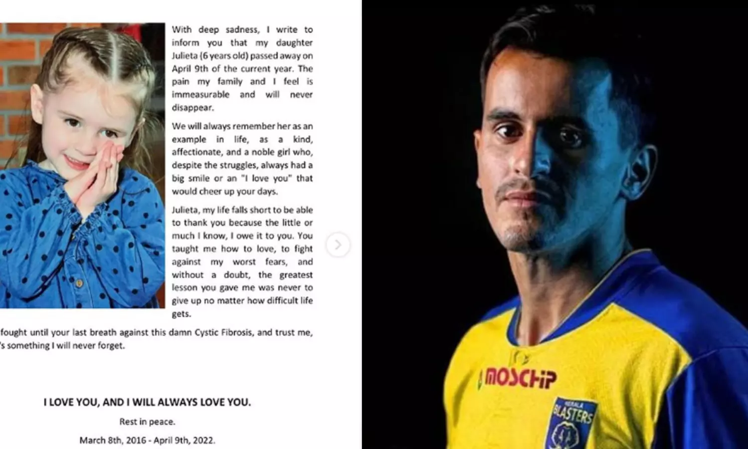 മകളുടെ വിയോഗത്തെ കുറിച്ച് വേദന നിറഞ്ഞ കുറിപ്പുമായി കേരള ബ്ലാസ്റ്റേഴ്സ് താരം അഡ്രിയാൻ ലൂണ. തന്റെ ആറ് വയസ്സുകാരിയായ മകൾ ജൂലിയേറ്റയുടെ മരണം ലൂണ ഇൻസ്റ്റഗ്രാമിലൂടെയാണ് അറിയിച്ചത്. ഏപ്രിൽ 9നാണ് ജൂലിയേറ്റ സിസ്റ്റിക് ഫൈബ്രോസിസ് എന്ന രോഗത്തോട് പോരാടി വിടവാങ്ങിയത്. ശ്വാസകോശത്തെയും മറ്റു ആന്തരികാവയവങ്ങളെയും ബാധിക്കുന്ന രോഗമാണിത്.