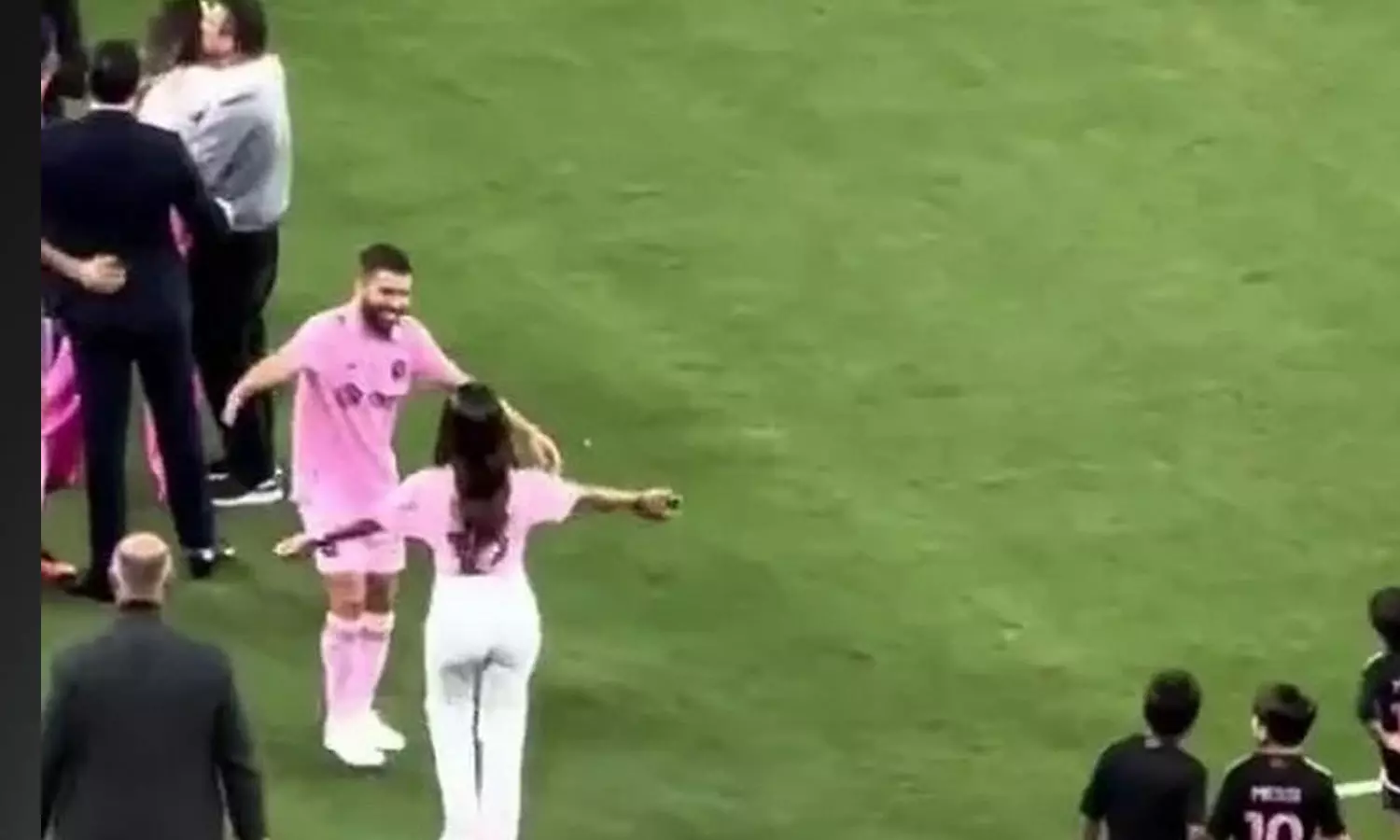 ഈ മത്സരത്തിന് ശേഷം നടന്ന രസകരമായൊരു സംഭവം സോഷ്യല് മീഡിയയില് വൈറലാണിപ്പോള്. മെസ്സിയുടെ ഭാര്യ ആന്റൊണല്ല റൊക്കൂസോക്ക് പറ്റിയ അമളിയാണ് സോഷ്യല് മീഡിയ ഏറ്റെടുത്തത്. മത്സര ശേഷം ഇന്റര് മയാമി താരങ്ങള് ആഘോഷങ്ങളിലായിരുന്നു. ഇതിനിടെ മെസ്സിയുടെ ഭാര്യയും മക്കളും മൈതാനത്തേക്കിറങ്ങി. മൈതാനത്ത് നില്ക്കുന്ന ഇന്റര്മയാമി താരം ജോര്ഡി ആല്ബയെ കണ്ട് മെസ്സിയാണെന്ന് തെറ്റിദ്ധരിച്ച് ഓടി ആലിംഗനം ചെയ്യാനെത്തിയ ആന്റൊണല്ലക്ക് താരത്തിന്റെ അടുത്തെത്തിയപ്പോഴാണ് അമളി മനസ്സിലായത്. ആന്റൊണല്ല തന്നെ പ്രശംസിക്കാനെത്തിയതാണ് എന്ന് നിഷ്കളങ്കമായി കരുതിയ ആല്ബക്ക് തെറ്റി. ആള് മാറിയെന്ന് മനസ്സിലായിക്കിയ ആന്റൊണെല്ല ഒരു പുഞ്ചിരിയോടെ മാറിപ്പോവുന്ന ദൃശ്യങ്ങള് സോഷ്യല് മീഡിയയില് വൈറലാണിപ്പോള്. ആല്ബ മെസ്സിയുടെ മക്കളെ ആലിംഗനം ചെയ്യുന്നതും വീഡിയോയില് കാണാം.