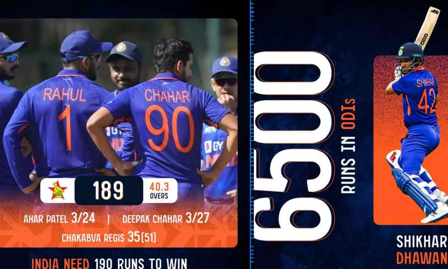 ആദ്യ ബാറ്റ് ചെയ്ത സിംബാബ്വെ 40.3 ഓവറിൽ പത്ത് വിക്കറ്റ് നഷ്ടത്തിൽ 189 റൺസാണ് നേടിയിരുന്നത്. ടോസ് നേടിയ ഇന്ത്യൻ നായകൻ കെഎൽ രാഹുൽ ബൗളിങ് തെരഞ്ഞെടുക്കുകയായിരുന്നു. മൂന്നു വിക്കറ്റ് വീതം നേടിയ ദീപക് ചഹർ, പ്രസിദ്ധ് കൃഷ്ണ, അക്സർ പട്ടേൽ എന്നിവരാണ് സിംബാബ്വെയുടെ നടുവൊടിച്ചത്. മുഹമ്മദ് സിറാജ് ഒരു വിക്കറ്റ് നേടിയപ്പോൾ സ്പിന്നർ കുൽദീപ് യാദവിന് വിക്കറ്റൊന്നും വീഴ്ത്താനായില്ല. പത്ത് ഓവറാണ് താരം എറിഞ്ഞത്.