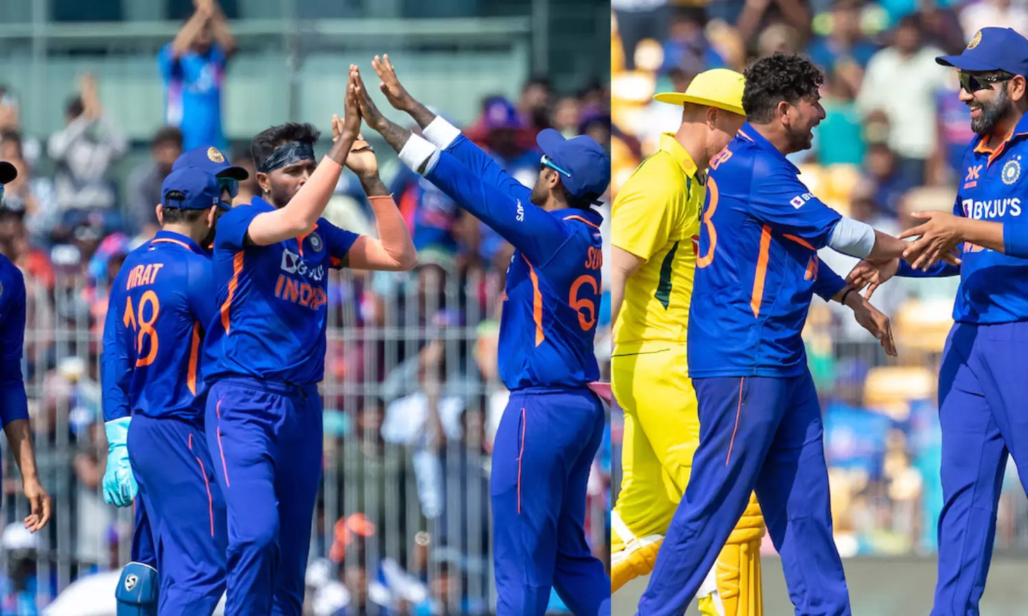 ടോസ് നേടി ബാറ്റിംഗിനിറങ്ങിയ ആസ്ത്രേലിയക്ക് മികച്ച തുടക്കമാണ് ലഭിച്ചത്. 10 ഓവറിൽ വിക്കറ്റ് നഷ്ടപ്പെടാതെ 50 റൺസ് കടന്ന ഓസീസിന്റെ ഓപ്പണർമാരെയും വൺഡൗണായെത്തിയ നായകനെയും വീഴ്ത്തി ഓൾറൗണ്ടർ ഹർദിക് പാണ്ഡ്യയാണ് ഇന്ത്യയ്ക്ക് ബ്രേക്ക് ത്രൂ നൽകിയത്. 11ാം ഓവറിൽ ഹെഡിനെ ഹർദിക് കുൽദീപിന്റെ കയ്യിലെത്തിക്കുകയായിരുന്നു. 13ാം ഓവറിൽ ഓസീസ് നായകൻ സ്റ്റീവ് സ്മിത്തിനെ പണ്ഡ്യയുടെ പന്തിൽ കെ.എൽ രാഹുൽ പിടികൂടി. 15ാം ഓവറിൽ അർധസെഞ്ച്വറിയുടെ പടിവാതിലിൽ നിൽക്കേ മാർഷിനെ ഹർദിക് ബൗൾഡാക്കി. 40 റൺസ് വിട്ടുനൽകി മൂന്നുവിക്കറ്റാണ് താരം വീഴ്ത്തിയത്. മൂന്നുവിക്കറ്റ് വീഴ്ത്തിയ കുൽദീപ് യാദവും ഇന്ത്യയ്ക്കായി തിളങ്ങി. ഡേവിഡ് വാർണർ, ലബൂഷെയിൻ, അലക്സ് കാരി എന്നിവരെയാണ് താരം പുറത്താക്കിയത്. കാരിയെ ബൗൾഡാക്കിയപ്പോൾ വാർണറെ ഹർദികും ലബൂഷെയിനെ ഗില്ലും പിടികൂടി.