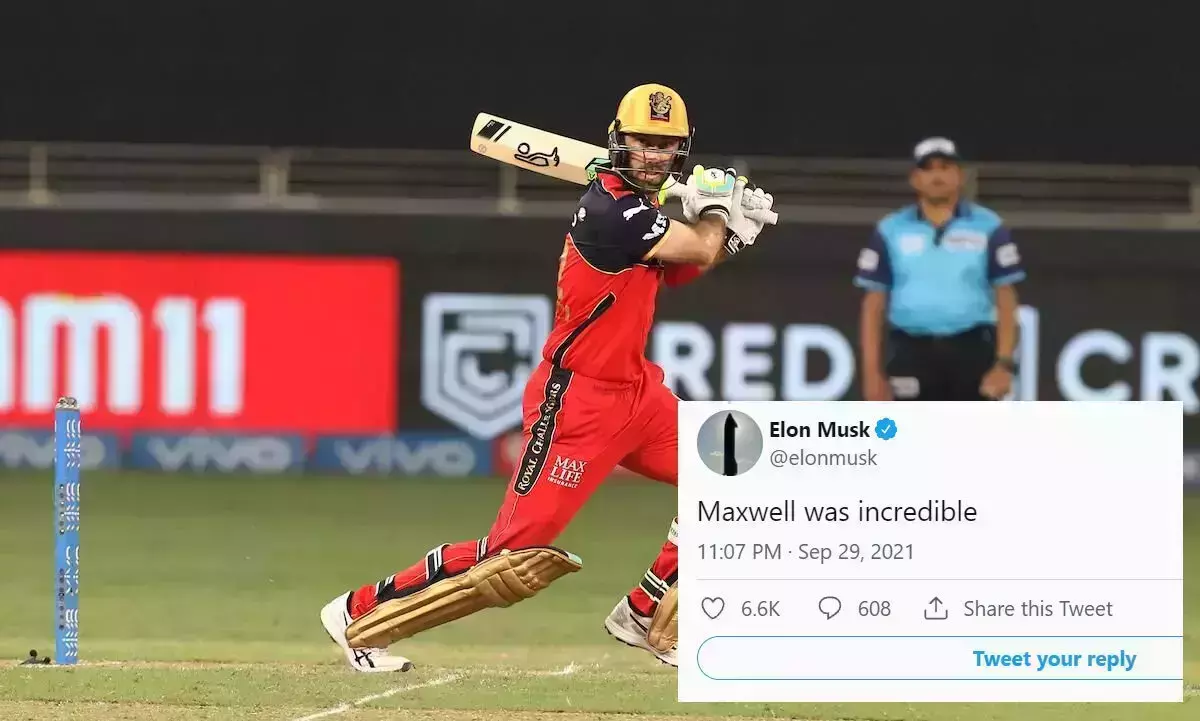 ബുധനാഴ്ച്ച നടന്ന മത്സരത്തിൽ ആർ.സി.ബിക്ക് വേണ്ടി ഗ്ലെൻ മാക്സ്വെൽ മികച്ച പ്രകടനം കാഴ്ചവെച്ചിരുന്നു. പുറത്താകാതെ മാക്സ്വെല് നേടിയ അര്ദ്ദ സെഞ്ച്വറിയാണ് ആര്.സി.ബിയെ വിജയത്തിലേക്ക് നയിച്ചത്. അതിന് പിന്നാലെയാണ് Maxwell is incredible എന്ന് മസ്ക് ട്വീറ്റ് ചെയ്തത്.