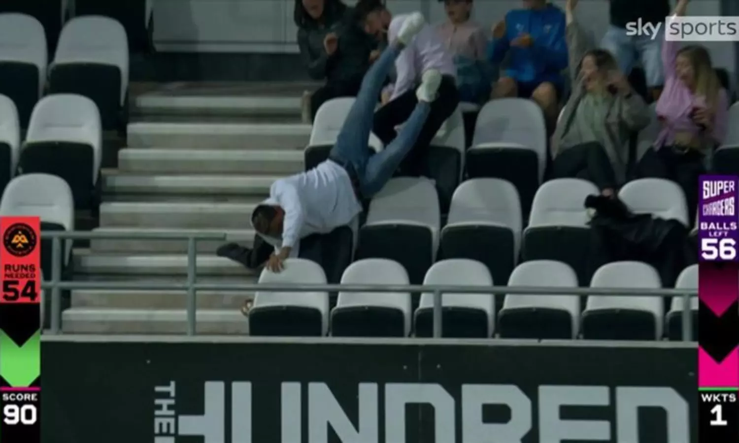 കസേരകളും ചാടിക്കടന്ന് ആരാധകന്റെ കിടിലന് ഡൈവിങ് ക്യാച്ച് !; വൈറല്