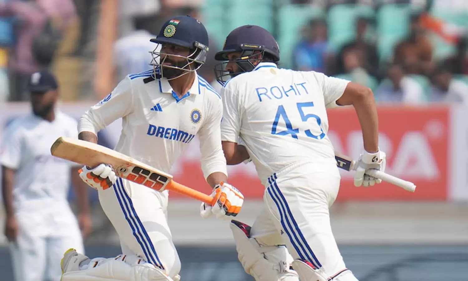 നേരത്തെ ടോസ് നേടി ബാറ്റിങ് തിരിഞ്ഞെടുത്ത ഇന്ത്യയുടെ തുടക്കം മോശമായിരുന്നു. വിശാഖപട്ടണം ടെസ്റ്റിൽ സെഞ്ചുറി നേടിയ യശ്വസി ജെയ്സ്വാൾ 10 റൺസെടുത്ത് പുറത്തായി. തുടർന്ന് ക്രീസിലെത്തിയ ശുഭ്മാൻ ഗിൽ വന്നതും പോയതും ഒരുമിച്ചായിരുന്നു. പൂജ്യത്തിനാണ് താരം മടങ്ങിയത്. നാലാമതായി ഇറങ്ങിയ രജത് പടിദാർ(5) കൂടി ഔട്ടായതോടെ ഇന്ത്യ 33-3 എന്നനിലയിൽ വൻതകർച്ച നേരിട്ടു. എന്നാൽ നാലാം വിക്കറ്റിൽ കൂട്ടുചേർന്ന രോഹിത്-ജഡേജ കൂട്ടുകെട്ട് ഇന്ത്യയെ കരകയറ്റുകയായിരുന്നു. ഇതിനിടെ കരിയറിലെ പതിനൊന്നാം ടെസ്റ്റ് സെഞ്ചുറിയും ഇന്ത്യൻ ക്യാപ്റ്റൻ കുറിച്ചു.