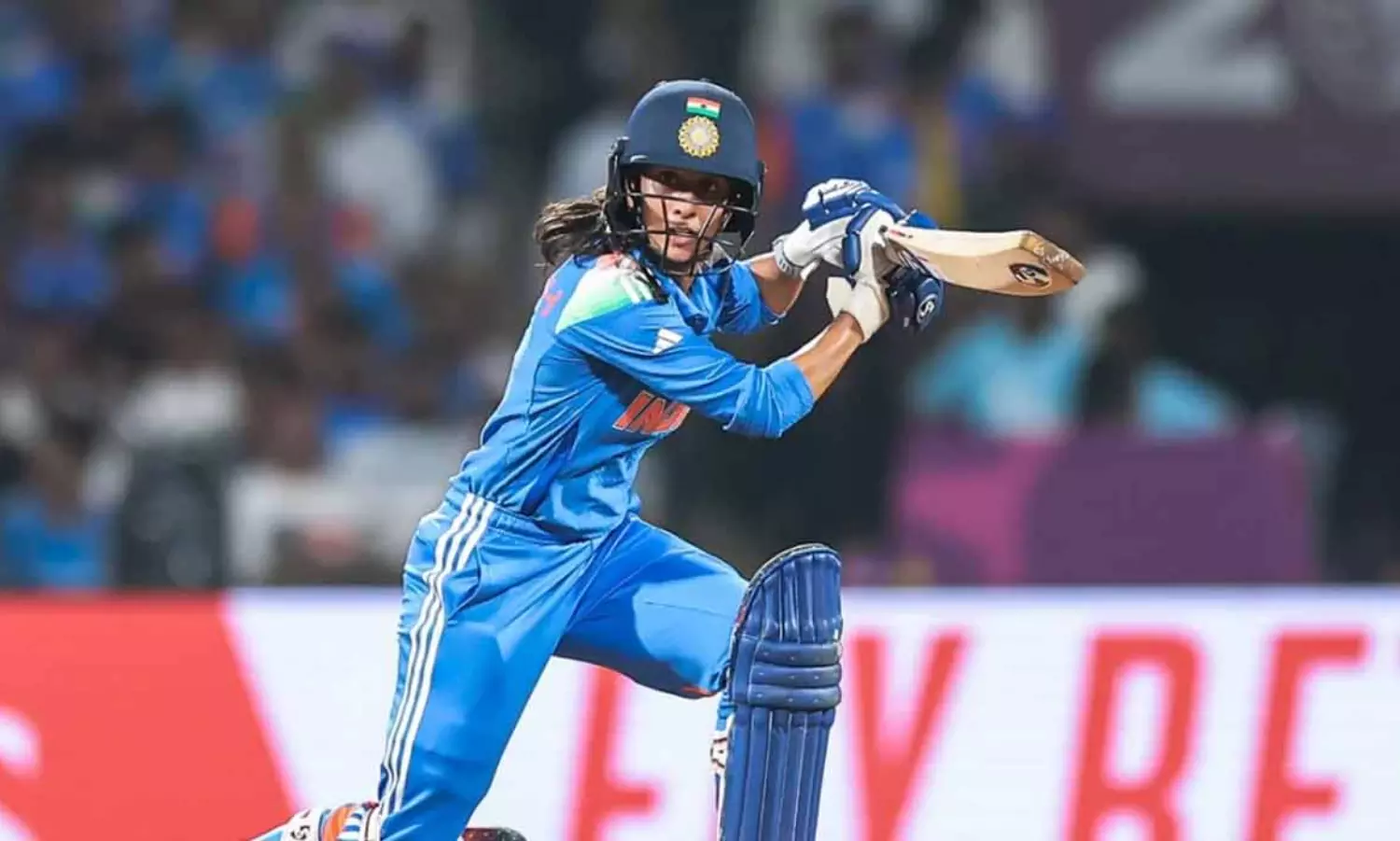 റെക്കോർഡ് വിജയലക്ഷ്യത്തിലേക്ക് ബാറ്റുവീശിയ ഇന്ത്യക്ക് തുടക്കത്തിൽ തന്നെ ഷഫാലി വർമയെ(10) നഷ്ടമായി. കിംഗ്രാത്തിന്റെ ഓവറിൽ വിക്കറ്റിന് മുന്നിൽകുരുങ്ങുകയായിരുന്നു. രണ്ടാം വിക്കറ്റിൽ ജെമീമ റോഡ്രിഗസും സ്മൃതി മന്ദാനയും ചേർന്ന് ഇന്ത്യയെ 50 കടത്തി. എന്നാൽ പവർ പ്ലെയിലെ അവസാന ഓവറിൽ കിം ഗാരത്തിന്റെ പന്തിൽ സ്മൃതി മന്ദാന നിർഭാഗ്യകരമായി പുറത്തായി. ലെഗ് സ്റ്റംപിന് പുറത്തുപോയ പന്തിൽ സ്മൃതി ബാറ്റ് വീശിയെങ്കിലും പന്ത് ബാറ്റിൽ കൊണ്ടില്ല. അമ്പയർ വൈഡ് വിളിക്കുകയും ചെയ്തു. എന്നാൽ പന്ത് കൈയിലൊതുക്കിയ ഓസീസ് ക്യാപ്റ്റൻ അലീസ ഹീലി ഔട്ടിനായി അപ്പീൽ ചെയ്തു. അൾട്രാ എഡ്ജിൽ സ്മൃതിയുടെ ബാറ്റിൽ പന്ത് ഉരസിയെന്ന് വ്യക്തമായതോടെ നിരാശയോടെ സ്മൃതി കളംവിട്ടു.