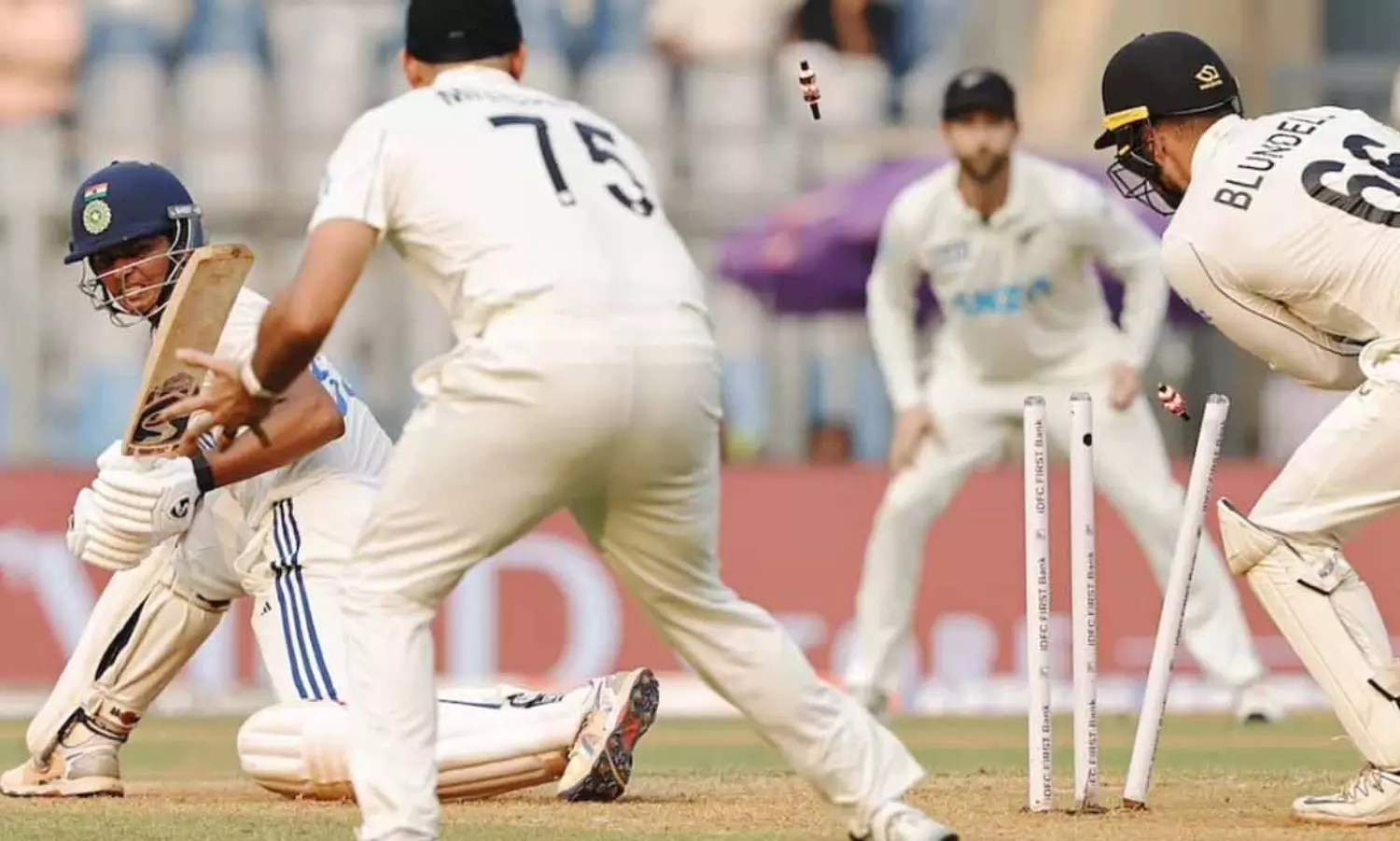 സ്കോർബോർഡിൽ 25 റൺസ് ചേർക്കുന്നതിനിടെ ഇന്ത്യക്ക് ആദ്യ വിക്കറ്റ് നഷ്ടമായി. മാറ്റ് ഹെൻട്രിയുടെ ഓവറിൽ ലഥാമിന് ക്യാച്ച് നൽകി ക്യാപ്റ്റൻ രോഹിത് ശർമ(18)പവലിയനിലേക്ക് നടന്നു. ഒരുലൈഫ് ലഭിച്ചിട്ടും അത് മുതലാക്കാൻ ഹിറ്റ്മാനായില്ല. തുടർന്ന് ക്രീസിലെത്തിയ ഗിൽ- യശസ്വി ജയ്സ്വാൾ (30) കൂട്ടുകെട്ട് ഇന്നിംഗ്സ് മുന്നോട്ട് കൊണ്ടുപോയി. 53 റൺസാണ് ഇരുവരും കൂട്ടിചേർത്തത്. എന്നാൽ ജയ്സ്വാളിനെ ക്ലീൻബൗൾഡാക്കി അജാസ് പട്ടേൽ കിവീസിന് ബ്രേക്ക് ത്രൂ നൽകി.