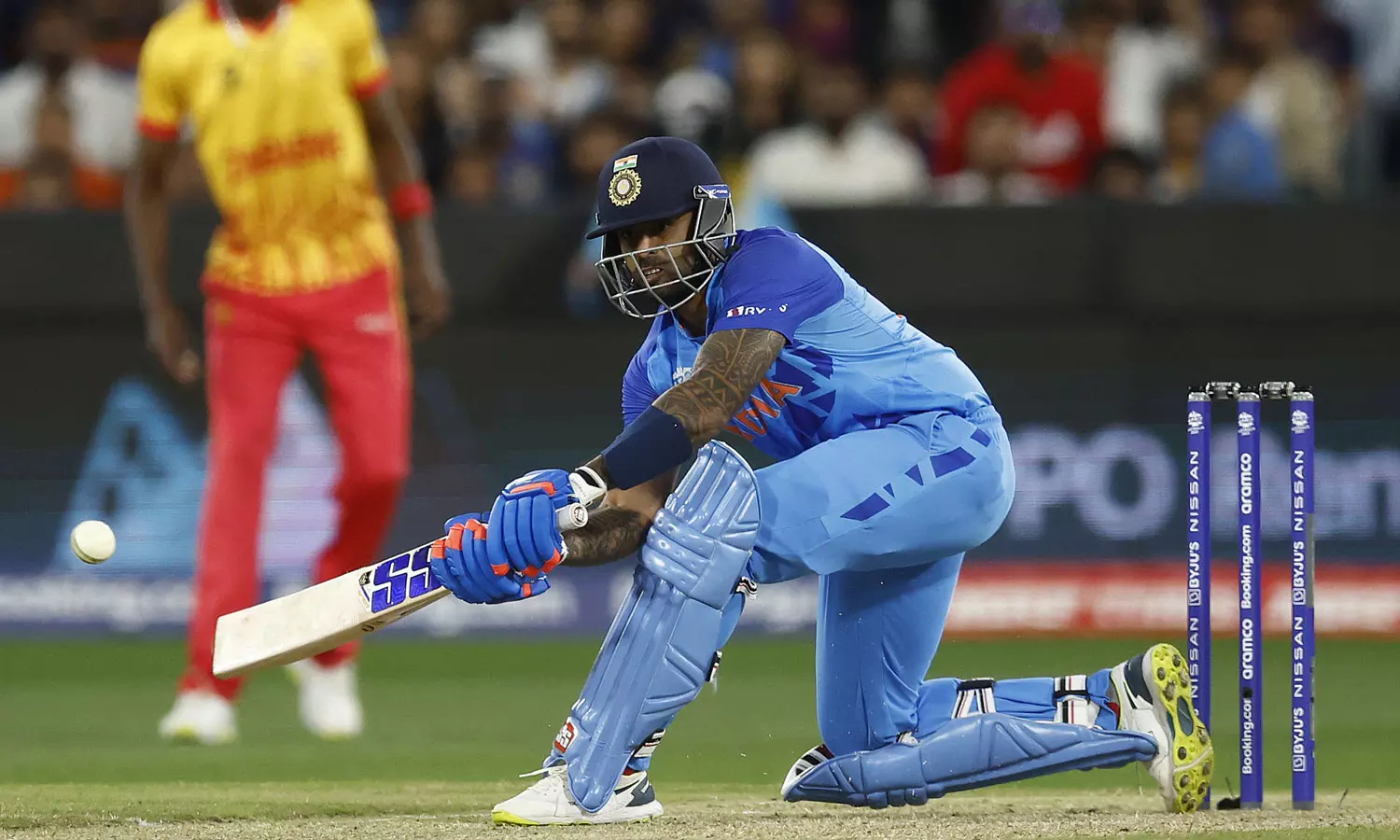 ബൗളർമാർ മികച്ച തുടക്കമാണ് സിംബാബ്വെക്ക് നൽകിയത്. ആദ്യ ഓവറിൽ ഇന്ത്യക്ക് റണ്ണൊന്നുമെടുക്കാനാകില്ല. 13 പന്തിൽ 15 റൺസെടത്തു നിൽക്കവെ നായകൻ രോഹിത് ശർമ്മയും പുറത്തായത്. വൺ ഡൗണായെത്തിയ കോലി സൂക്ഷ്മതയോടെ കളിച്ചെങ്കിലും 26 റൺസ് എടുത്തു നിൽക്കവെ വീണു. അർധ സെഞ്ച്വറി പൂർത്തിയാക്കിയതിന് പിന്നാലെ രാഹുലും പുറത്തായി. ഈ ലോകകപ്പിൽ കിട്ടിയ ആദ്യത്തെ അവസരം മുതലാക്കാൻ റിഷഭ് പന്തിനായില്ല. മൂന്നു പന്തിൽ അഞ്ചു റൺസാണ് വിക്കറ്റ് കീപ്പർ നേടിയത്. പിന്നീടെത്തിയ സൂര്യകുമാർ യാദവ്, ഹർദിക് പാണ്ഡ്യയെ കൂട്ടുപിടിച്ച് നിറഞ്ഞാടുകയായിരുന്നു. നാലു സിക്സറുകളുടെയും ആറു ഫോറുകളുടെയും അകമ്പടിയോടെയാണ് സൂര്യയുടെ ഇന്നിങ്സ്.