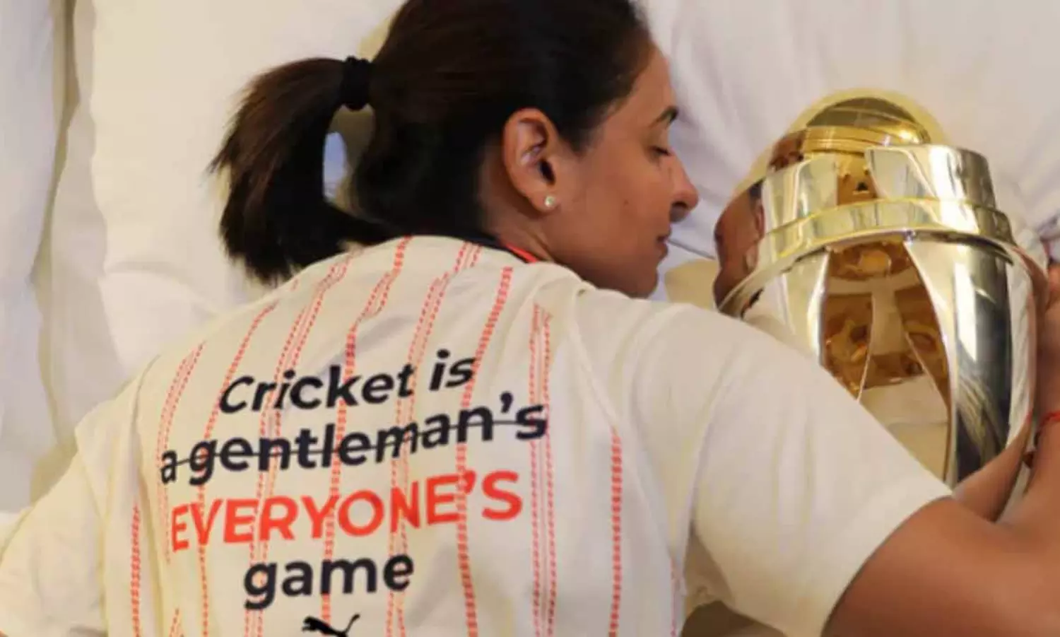 കിരീടം ചൂടിയതിന് പിന്നാലെ ഇന്ത്യൻ ക്യാപ്റ്റൻ ഹർമൻപ്രീത്കൗർ സമൂഹ മാധ്യമങ്ങളിൽ പങ്കുവെച്ച ചിത്രമാണ് പഴയകാര്യങ്ങൾ ഇപ്പോൾ വീണ്ടും ഓർമിപ്പിച്ചത്. ക്രിക്കറ്റ് മാന്യൻമാരുടെ മാത്രം കളിയല്ലെന്നും, എല്ലാവരുടെയും കളിയാണെന്നുമാണ് ഹർമൻ പറയാതെ പറഞ്ഞത്. ലോകകപ്പ് കിരീടവുമായി ഉറങ്ങുന്ന ചിത്രം പങ്കുവെച്ച ഇന്ത്യൻ വനിതാ ടീം ക്യാപറ്റന്റെ ടീഷർട്ടിലാണ് ക്രിക്കറ്റ് എല്ലാവരുടേതുമാണെന്ന് രേഖപ്പെടുത്തിയത്.