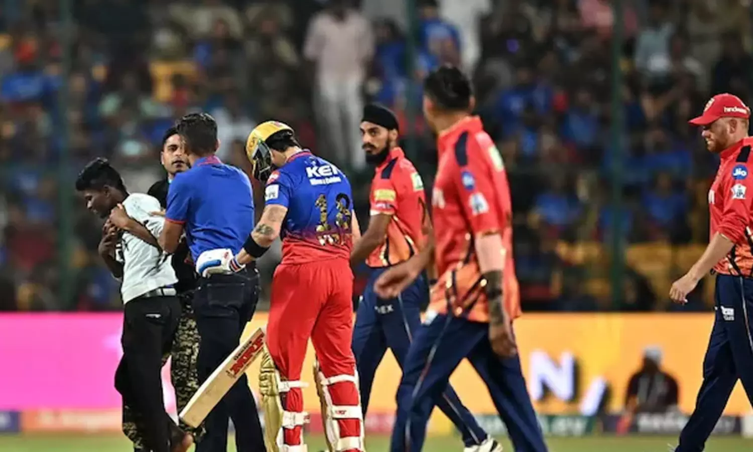 ആര്സിബിയുടെ ബാറ്റിങിനായി വിരാട് കോഹ്ലി ക്രീസിലെത്തിയ ഉടനെയാണ് സുരക്ഷാ ഉദ്യോഗസ്ഥരുടെ കണ്ണുവെട്ടിച്ച് ആരാധകന് ഗ്രൗണ്ടിലേക്ക് ഓടിയെത്തിയത്.